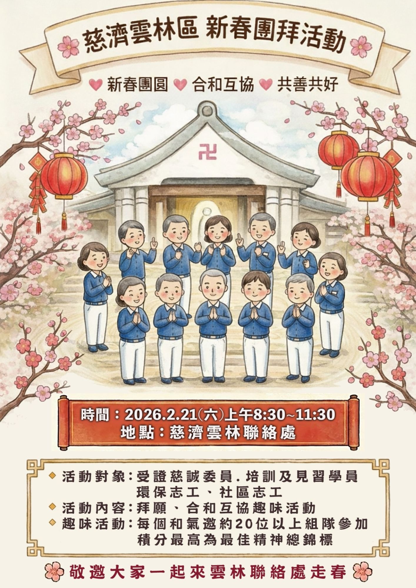 【雲林】慈濟雲林聯絡處 新春共善共好 分享好友 2026/02/21 12:00 ( 02/05 10:11更新) 2026年邀您闔家一起來~ 雲林聯絡處迎新年新春團拜活動 活動內容: 新春團圓 趣味活動 地址:雲林聯絡處 時間:02/21(六)08:30–11:30 新春團拜,邀您與親友齊聚一堂,在互動與歡笑中迎接嶄新的一年。讓祝福匯聚,讓年味在相聚中慢慢延伸。 登入後可以閱讀全文 分享好友 喜歡我們的文章嗎?歡迎加入慈善新聞網