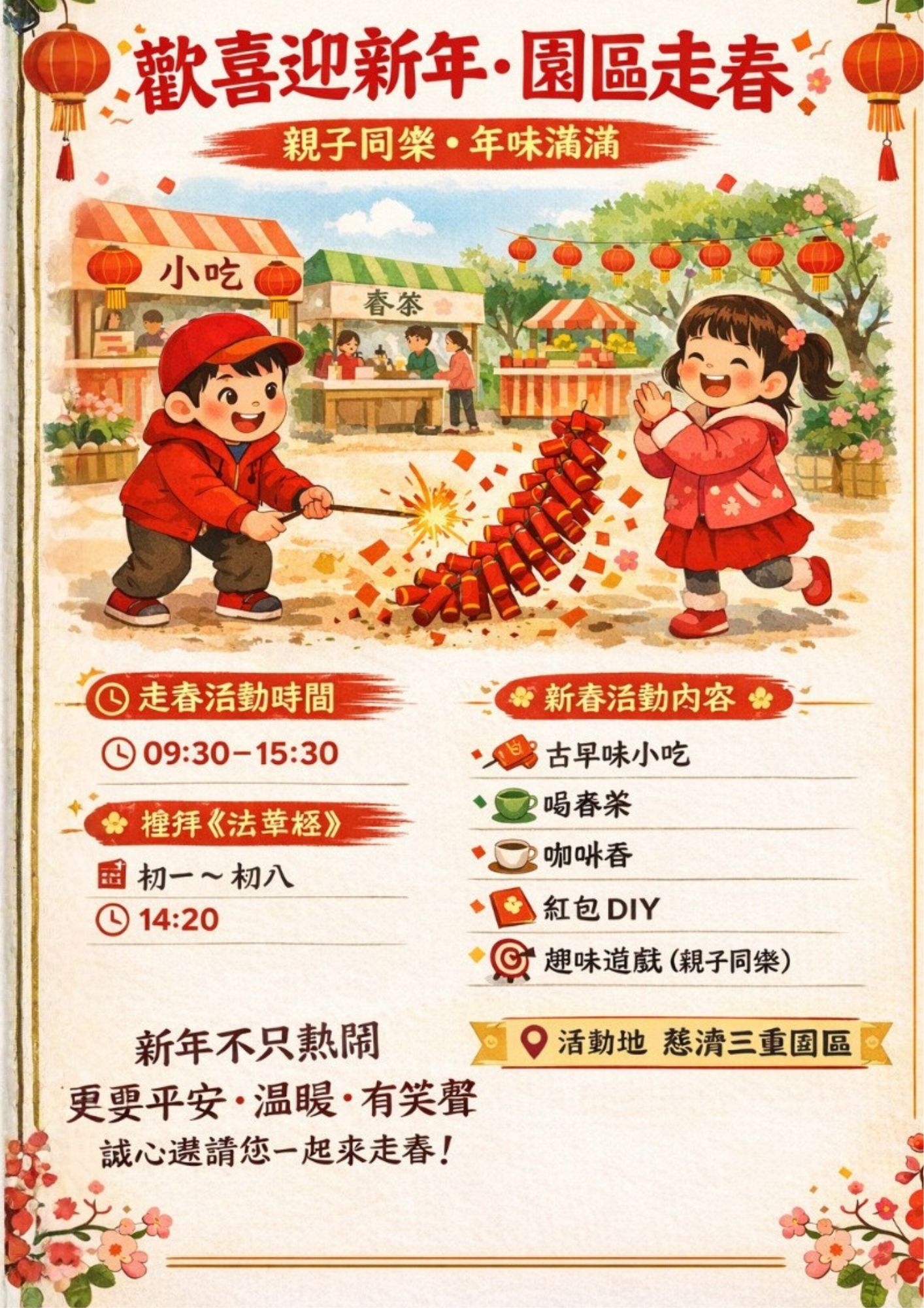 【新北】三重靜思堂園區 親子同樂 歡喜迎新年 分享好友 2026/02/24 17:00 ( 02/05 10:50更新) 2026年邀您闔家一起來~ 三重靜思堂歡喜迎新年! 活動內容: 古早味小吃體驗 喝春茶 咖啡香 紅包DIY 趣味遊戲親子同樂 地址:三重靜思堂 時間:02/17(大年初一)09:30–15:30 新年不只熱鬧...更邀您與家人一起感受平安、溫暖與歡笑!在互動與美味中,讓新年的祝福自然流淌,年味就在每一刻~~~ 登入後可以閱讀全文 關鍵字: 走春 分享好友 喜歡我們的文章嗎?歡迎加入慈善新聞網