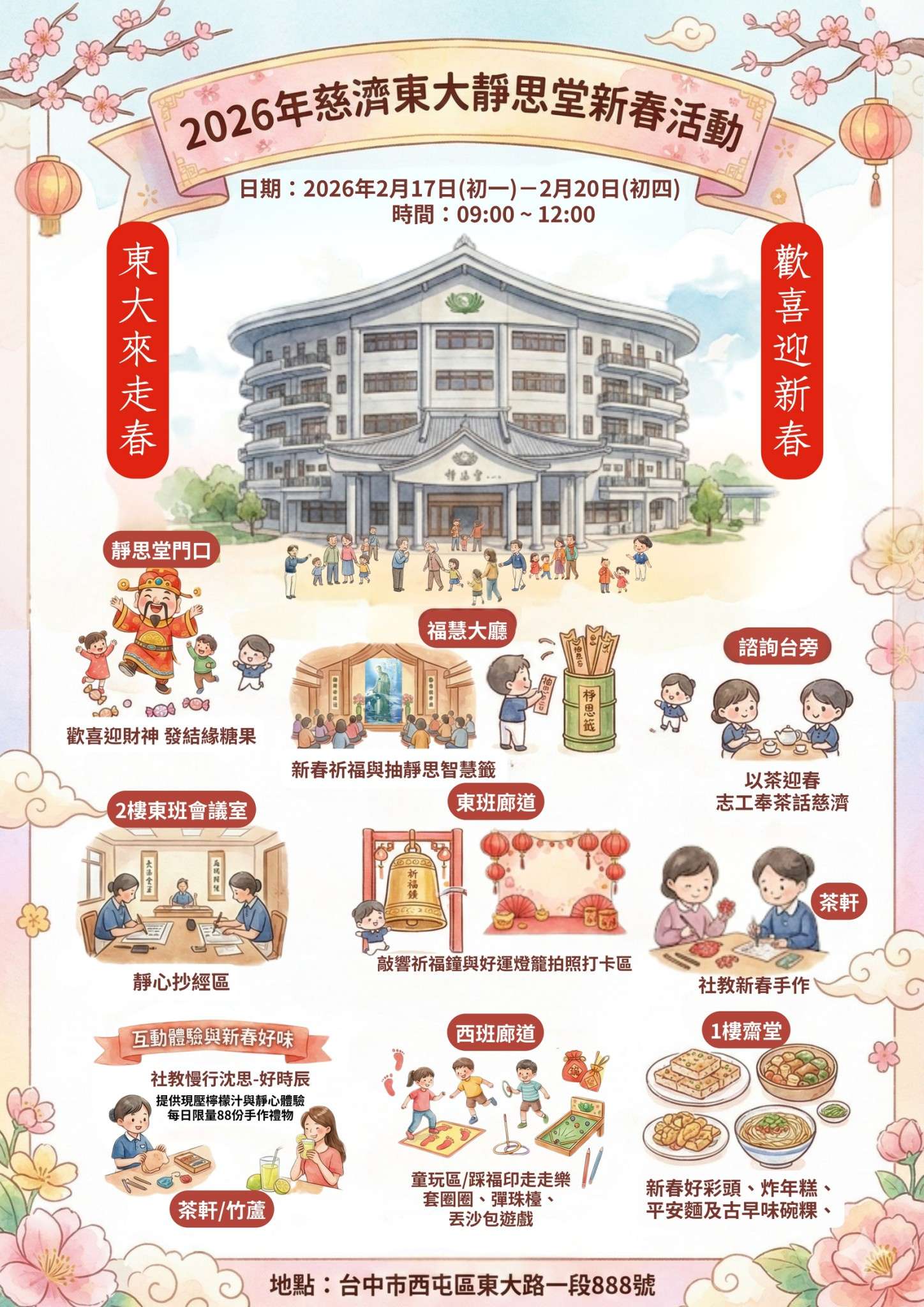 【臺中】東大靜思堂園區 歡喜迎新春! 分享好友 2026/02/20 10:00 ( 02/09 10:48更新) 2026年邀您闔家一起來~ 東大靜思堂迎新年!來走春! 活動內容: 茶軒 童玩區 靜心抄經 抽靜思語籤詩 奉茶 地址:東大靜思堂 時間:02/17(大年初一)~ 02/20(大年初四)09:00–12:00 新年不只熱鬧,更邀您與家人一起到東大靜思堂感受平安、溫暖與歡笑~在互動與美味中,讓新年的祝福自然流淌,年味就在每一刻! 登入後可以閱讀全文 關鍵字: 走春 分享好友 喜歡我們的文章嗎?歡迎加入慈善新聞網