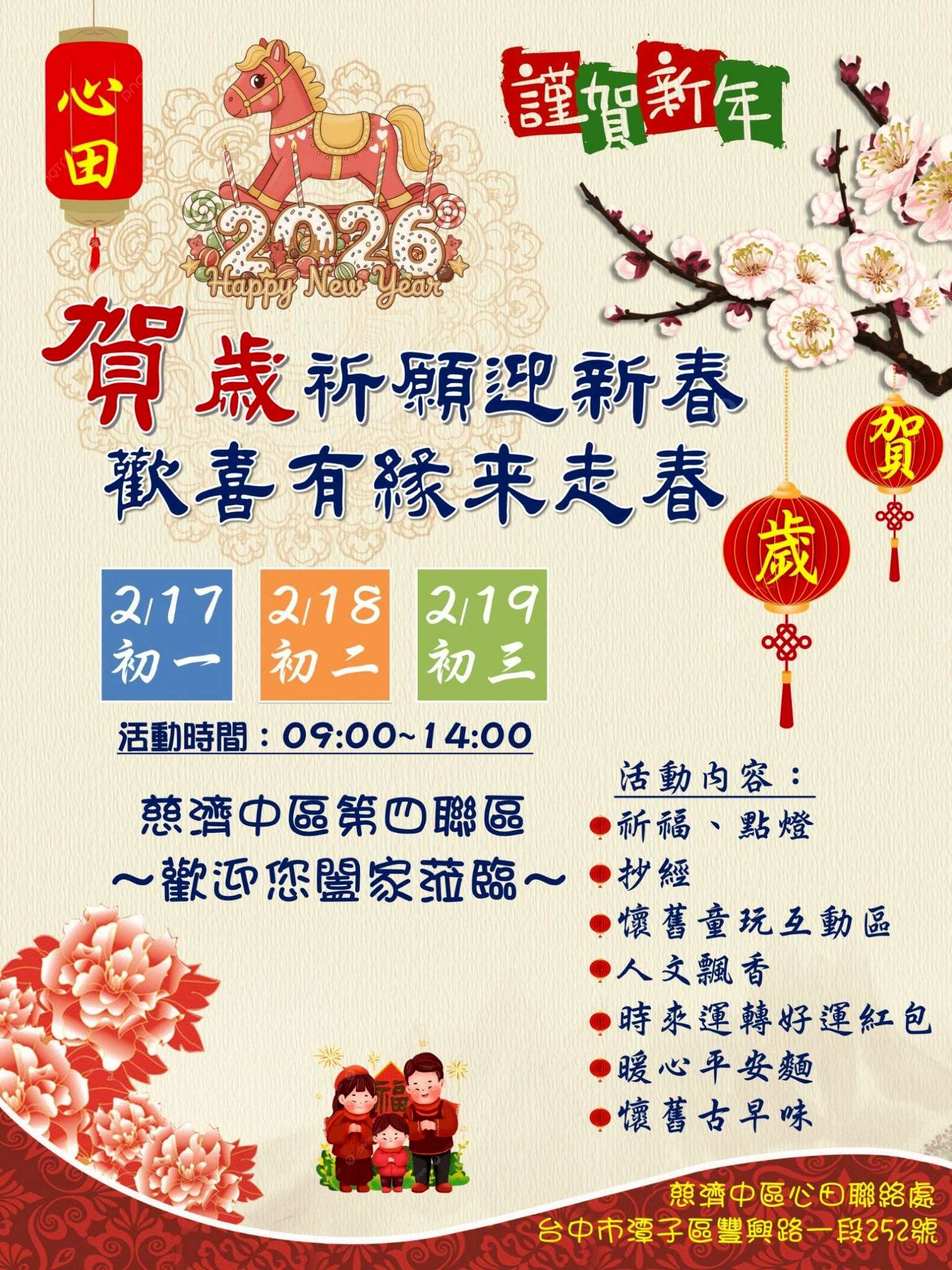 【臺中】慈濟中區心田聯絡處 歡喜有緣來走春 分享好友 2026/02/19 14:00 ( 02/09 10:48更新) 2026年邀您闔家一起來~ 慈濟中區第四聯區心田聯絡處歡喜迎新年! 活動內容: 祈福點燈 抄經 人文飄香 懷舊古早味 地址:慈濟中區第四聯區心田聯絡處(台中市潭子區豐興路一段252號) 時間:02/17(大年初一)~ 02/19(大年初三)09:00–14:00 新年不只熱鬧,更邀您與家人一同走進心田聯絡處,感受平安、溫暖與歡笑。在互動與美味中迎接新的一年,讓祝福自然流動,年味就在每一刻~~~ 登入後可以閱讀全文 關鍵字: 走春 分享好友 喜歡我們的文章嗎?歡迎加入慈善新聞網