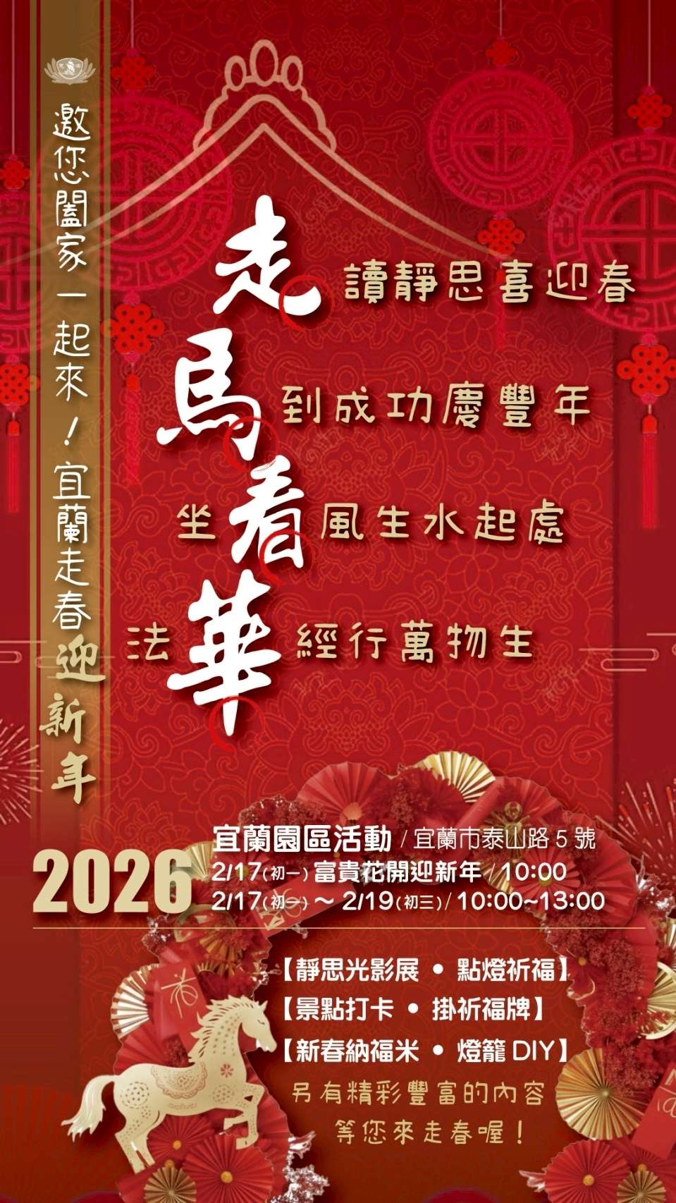 【宜蘭】慈濟宜蘭園區 走馬看華 迎新年 分享好友 2026/02/19 15:00 ( 02/09 10:49更新) 2026年邀您闔家一起來~ 慈濟宜蘭園區迎新年 走讀靜思喜迎春馬到成功慶豐年坐看風生水起處法華經行萬物生 地址:宜蘭市泰山路5號 時間:02/17(大年初一)至 02/19(大年初三)10:00–13:00 新春走讀宜蘭園區,邀您放慢腳步,在靜思人文與自然景致中迎接新的一年。以清淨心走春,以善念同行,讓年味在行走之間,悄悄盛開...... 登入後可以閱讀全文 關鍵字: 走春 分享好友 喜歡我們的文章嗎?歡迎加入慈善新聞網