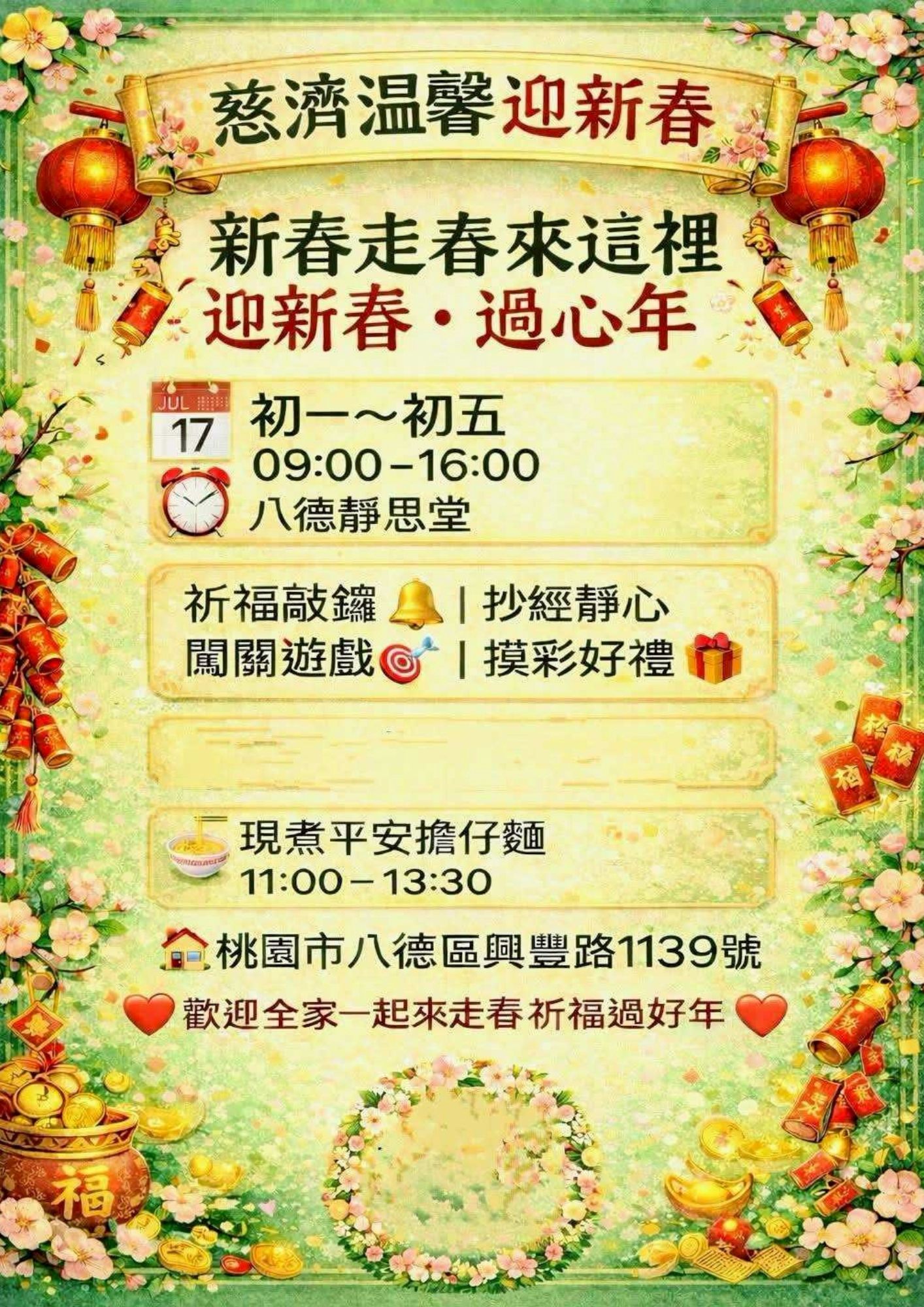 【桃園】八德靜思堂 迎新春 過心年 分享好友 2026/02/20 17:00 ( 02/11 15:10更新) 2026年邀您闔家一起來~ 八德靜思堂迎新年 活動內容: 祈平安 敲鐘擂鼓 闖關遊戲 地點:桃園市八德區興豐路1139號(八德靜思堂) 時間:02/17 初一 ~ 02/21 初五 09:00-16:00 當天更多精彩活動,邀您闔家一起來走春! 登入後可以閱讀全文 關鍵字: 走春 分享好友 喜歡我們的文章嗎?歡迎加入慈善新聞網