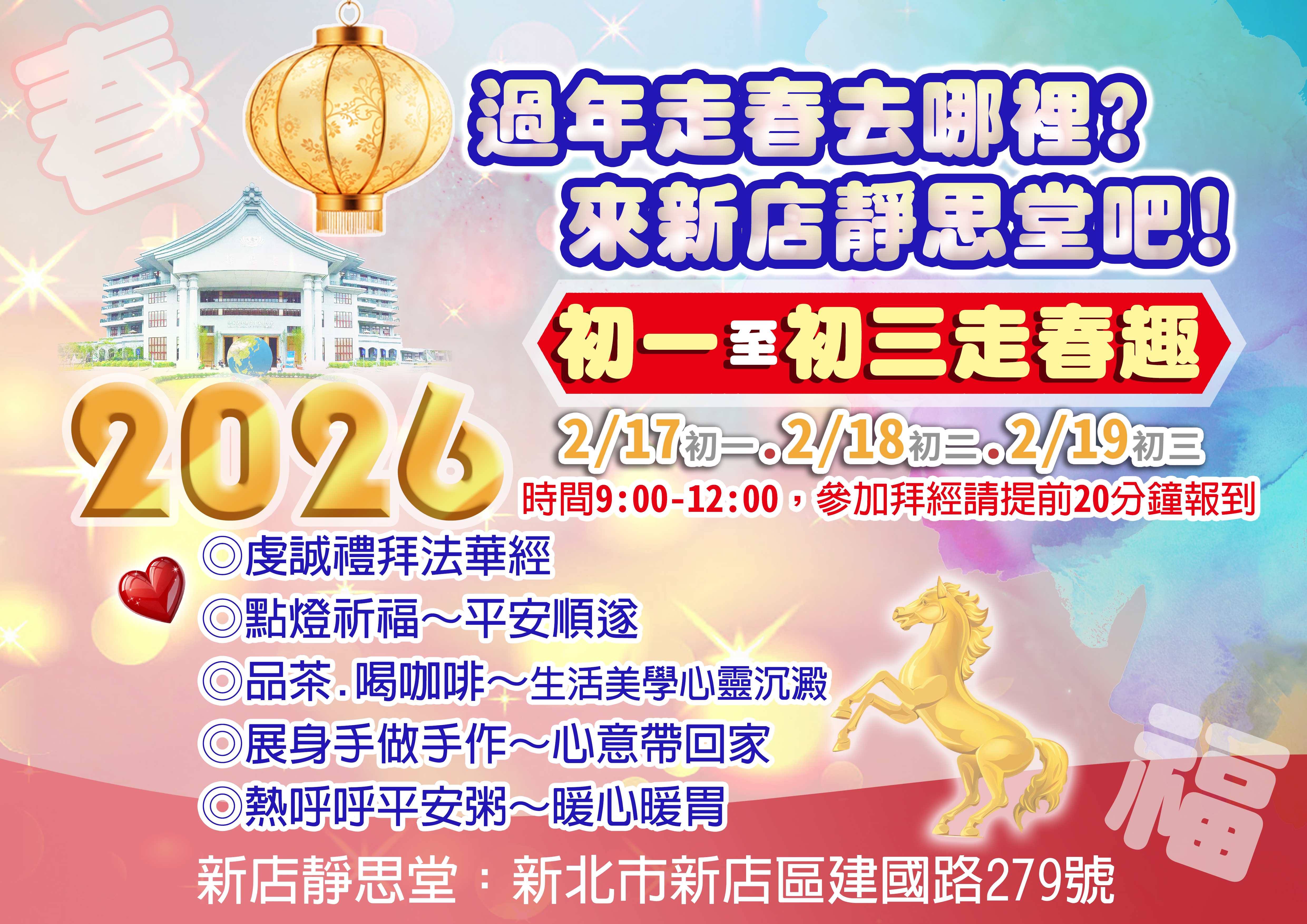 【新北】過年走春去哪裡? 來新店靜思堂吧! 分享好友 2026/02/19 20:47 ( 02/15 20:49更新) 過年走春去哪裡? 來新店靜思堂吧!地址:新北市新店區建國路279號2026年2月17(初一)、18(初二)、19(初三) 虔誠禮拜法華經 點燈祈福~平安順遂 品茶.喝咖啡~生活美學心靈沉澱 展身手做手作~心意帶回家 熱呼呼平安粥~暖心暖胃 登入後可以閱讀全文 關鍵字: 新店靜思堂 分享好友 喜歡我們的文章嗎?歡迎加入慈善新聞網
