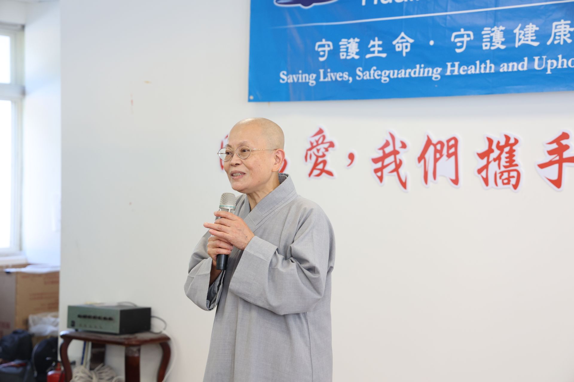 德懷法師代表證嚴上人送上對鄉親及醫療站的祝福。德懷法師開示,慈善醫療同行,心靈關懷是最重要的。這段時間看到災民從心情震撼到平穩,相信是大醫王和白衣大士守護生命守護健康守護愛的努力成果,醫療是長情大愛,之後中長期希望慈善醫療合作,讓居民可以安身又安心。