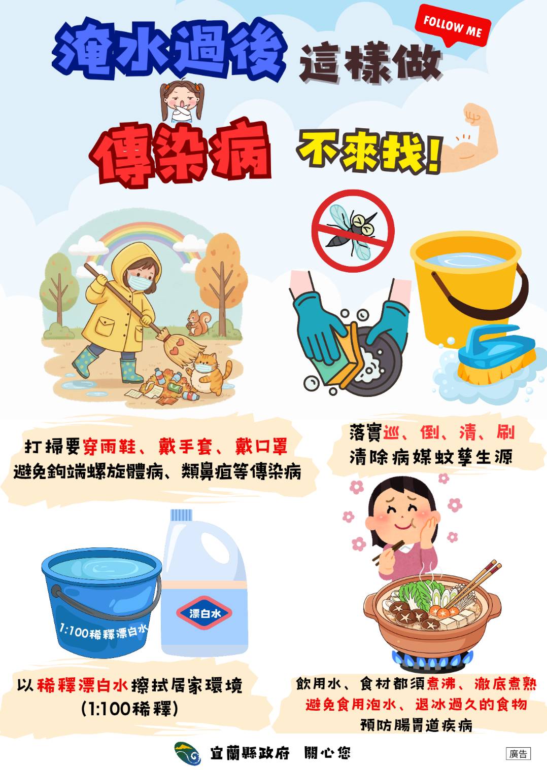 衛生局徐迺維局長特別提醒,風災大雨過後,易使土壤及泥水中的病源菌暴露於地面,除了接觸傳播外,也可能經由食用受汙染的水或吸入性感染。民眾災後整理居家環境,消毒可以使用市售含氯漂白水(約含次氯酸鈉5%)稀釋100倍擦拭。清理家園時,務必穿著雨鞋或防水長靴、配戴防水手套及口罩,做好個人防護措施,工作完畢或裝備卸除後,應以肥皂及清水洗手。老年人、身體衰弱、免疫功能不佳、慢性病患者(糖尿病、心臟病、高血壓、癌症及酒癮者等)及皮膚有外傷者,應避免皮膚暴露於污水或淤泥,如有出現發燒、頭痛、肌肉痛、腹痛、腹瀉、黃疸、倦怠或其他身體不適的症狀,請儘快就醫。