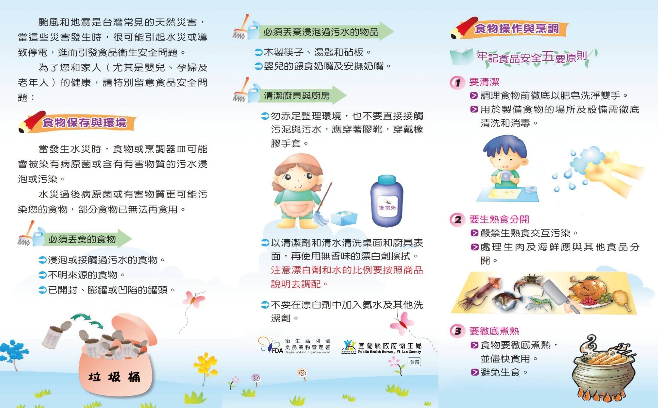 為杜絕泡水、過期或變質食品流入市面,衛生局加強稽查災區食品業者,除叮囑販賣業者應注意食品貯存條件(冷藏7℃以下;冷凍-18℃以下),並將停電期間及淹水之產品立即下架,以確保災民不受二次傷害;同時,籲請所有食品業者於災後期間,為了民眾健康及權益,更應提高警覺,從食材驗收、保存、完全烹煮、運送、供應及從業人員衛生習慣等各流程應更用心。豪雨可能導致飲用水受到汙染,若住宅的蓄水池淹水,應確實清洗消毒後再蓄水;飲用水要徹底煮沸或飲用包裝水;泡水之廚房用具及餐具要消毒後才能使用,泡過水或解凍過久的食物不可食用;並依「清除、清潔、消毒」三步驟,做好環境衛生。