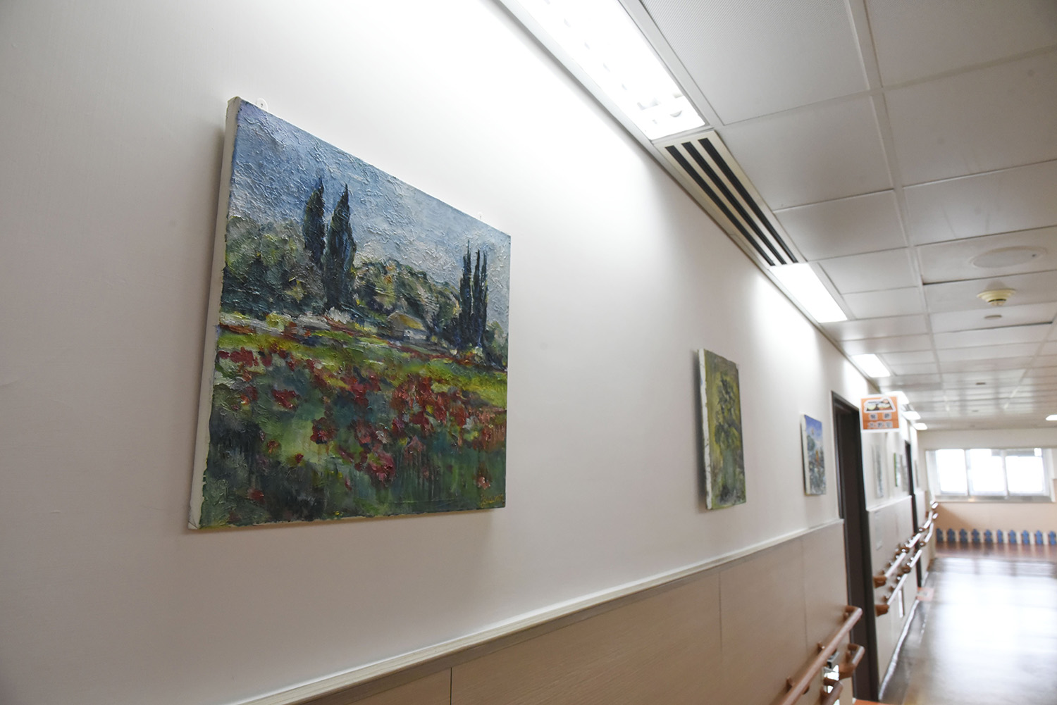 現場展出油畫的作者顏女士表示,母親之前在輕安居住兩年,自己也曾因手術及小中風後入住,期間深刻感受到機構良好的環境與貼心的照護品質,無論是照服人員或醫療團隊都十分用心,「給一百分的肯定」。她說,對繪畫的興趣源自高中時期,曾在課後由老師私下指導油畫技巧,真正開始投入創作,則是在55歲退休之後,選擇做自己喜歡的事,陸續參加畫畫課程,慢慢學習、持續創作。適逢輕安居成立六周年,她特別挑選十多幅油畫作品於現場展出,希望為機構環境增添藝術氣息,也期盼讓同樣喜愛繪畫的住民在欣賞作品時,能感受到愉悅與療癒,為生活注入更多美好能量。