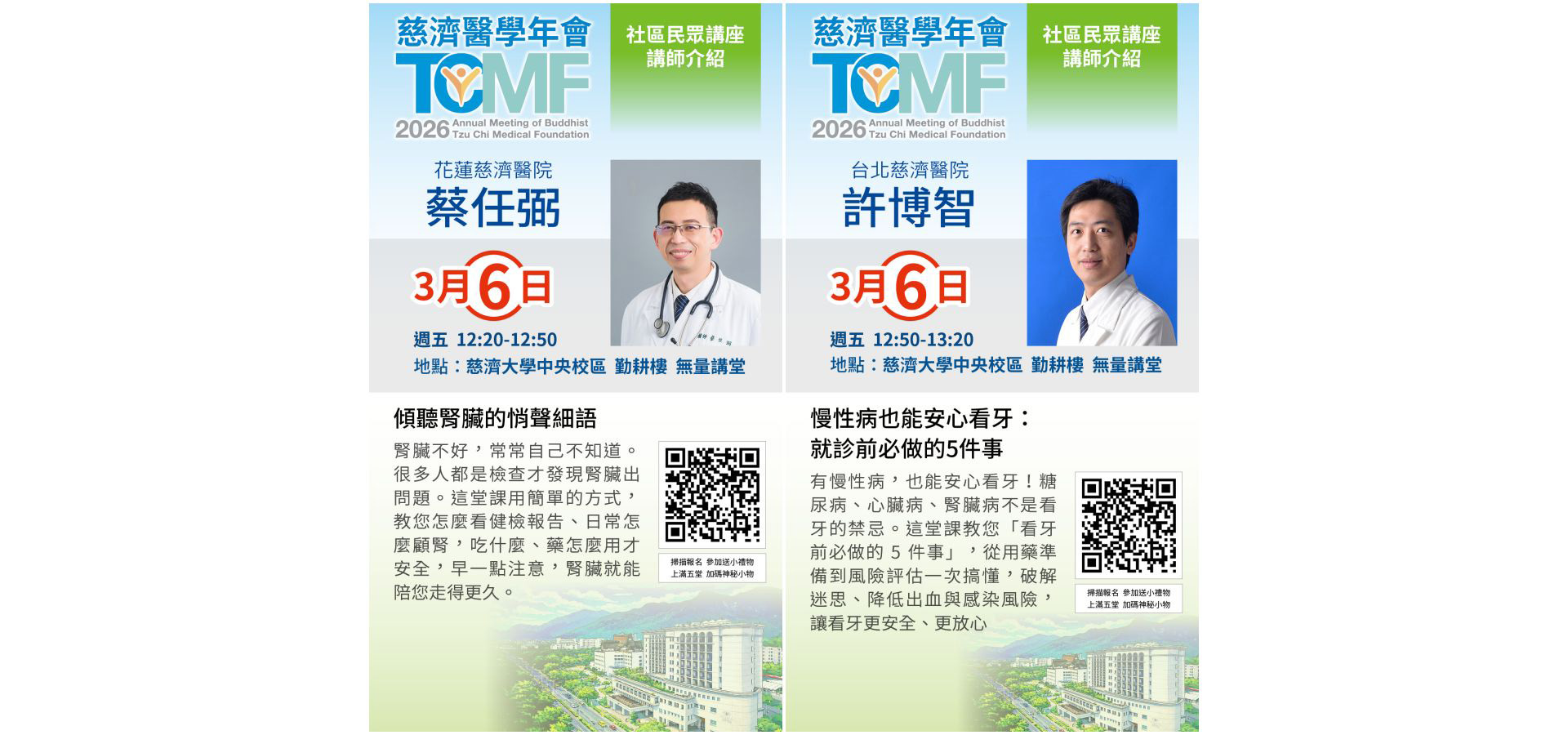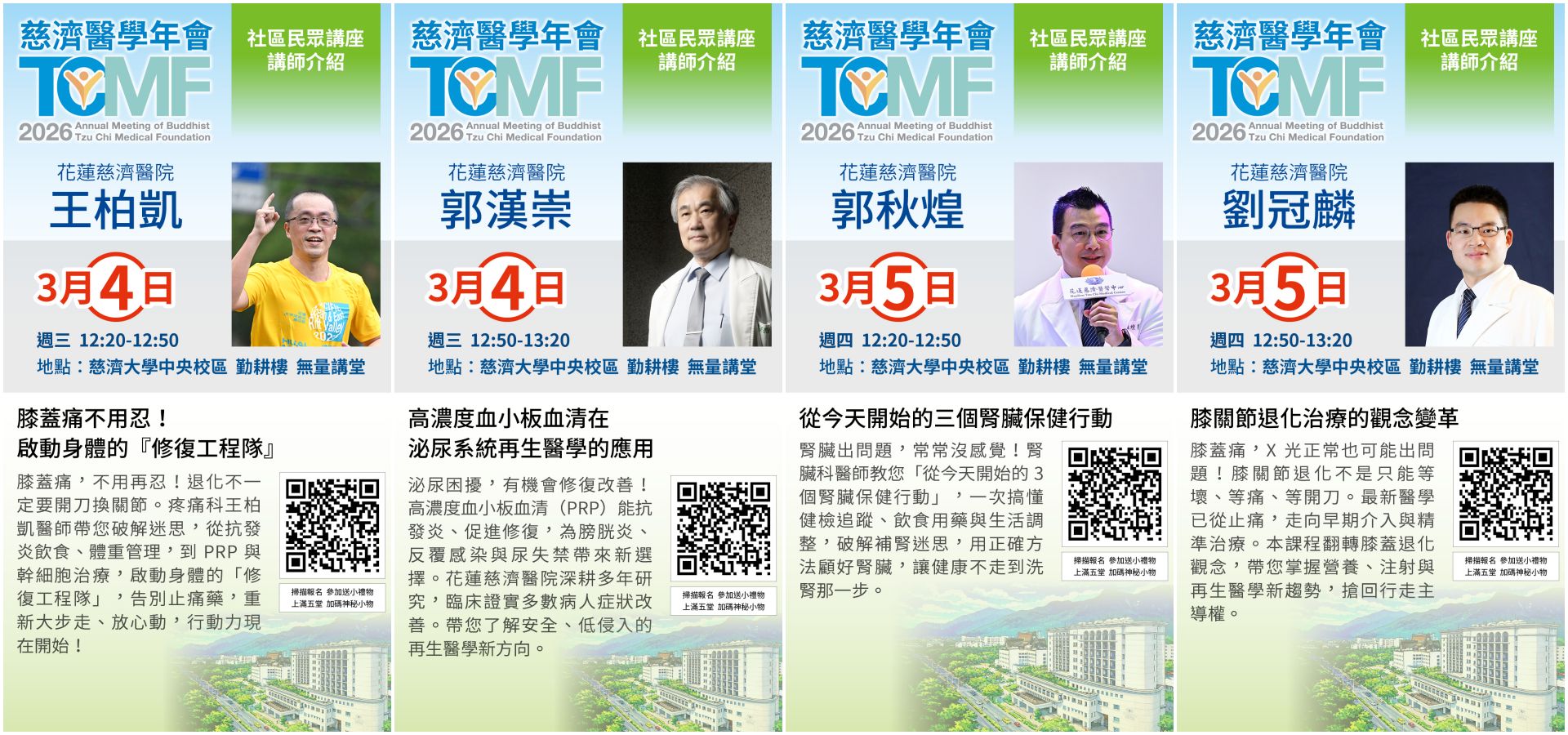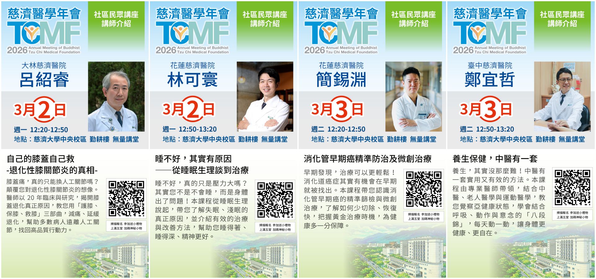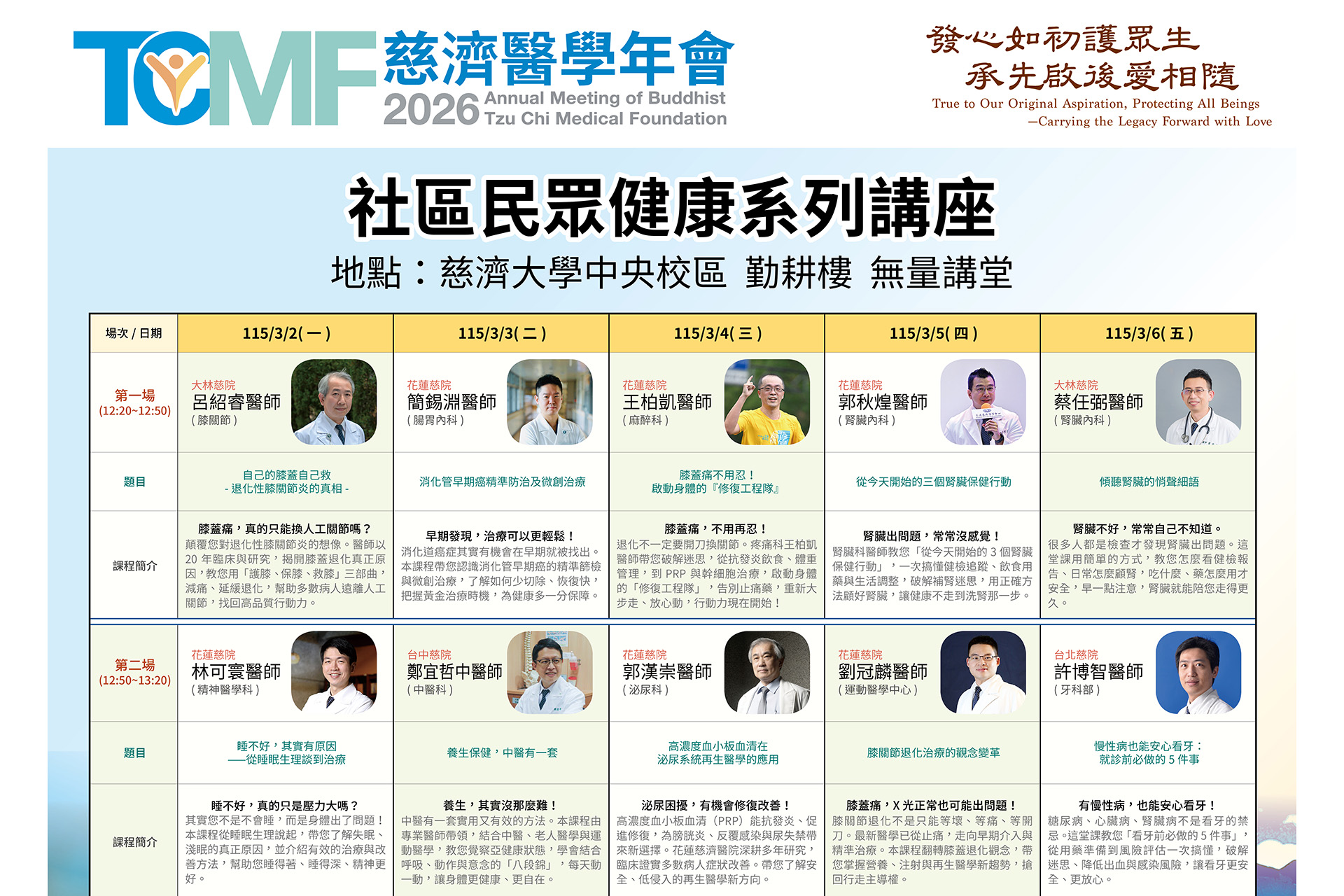 2026年慈濟醫學年會即將於3月2日(週一)於花蓮慈濟園區盛大開幕,慈濟醫療法人為了將專精的醫學研究成果與花蓮民眾分享,連續五天在午間12點20分到13點20分,於慈濟大學無量講堂,舉辦「專家在身邊,健康一把抓—民眾講座」,十場講座匯集慈濟醫療四大院區共十位臨床與醫學研究專家,歡迎民眾踴躍參加。
