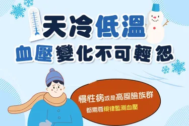 天冷低溫 血壓變化不可輕忽根據中央氣象局指出,週末(17至18日)受大陸冷氣團南下影響,當氣溫降低或溫度驟降時,容易造成血壓突然升高,出門活動需添加衣物並注意保暖,如果是慢性病或是高風險族群如有抽菸、酗酒、肥胖、缺乏運動,以及...