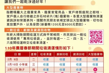歲末年終大掃除 小年夜照常收運垃圾新的一年即將到來,為讓市民朋友除舊布新展望新年,臺北市環保局規劃即日起至2月3日列為「年終大掃除」期間,請市民朋友預先整頓居家與周邊環境,將家中汰換的舊家具、廢家電等大型廢棄物,預約交由各區清潔隊免...