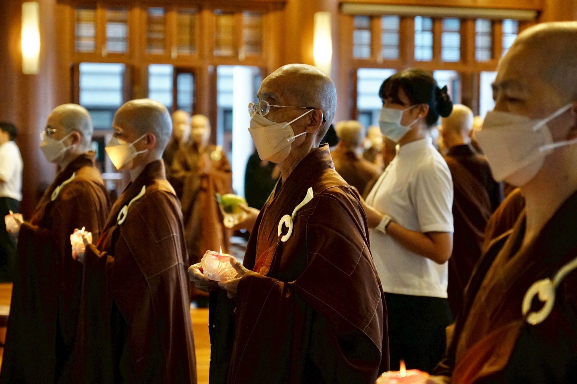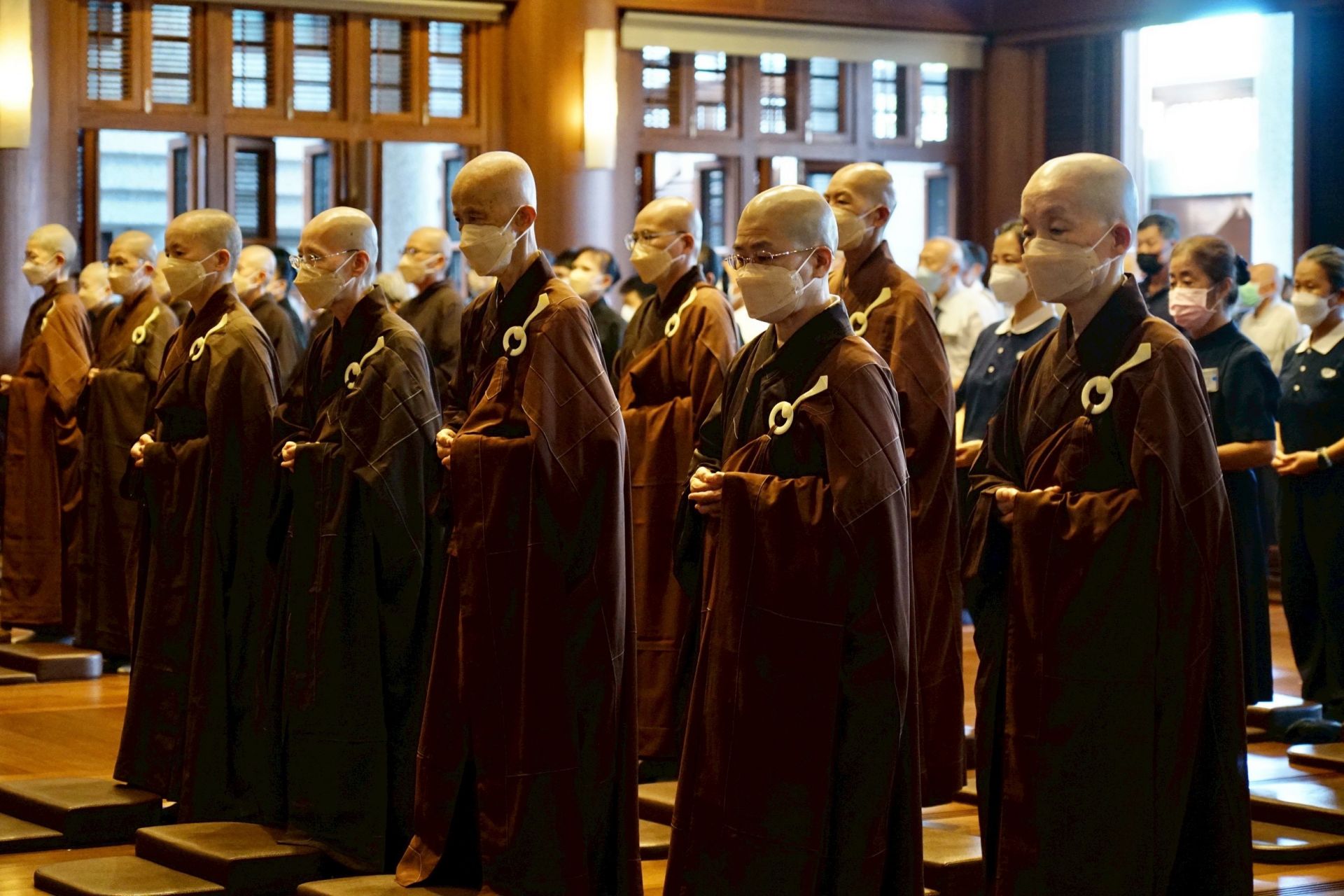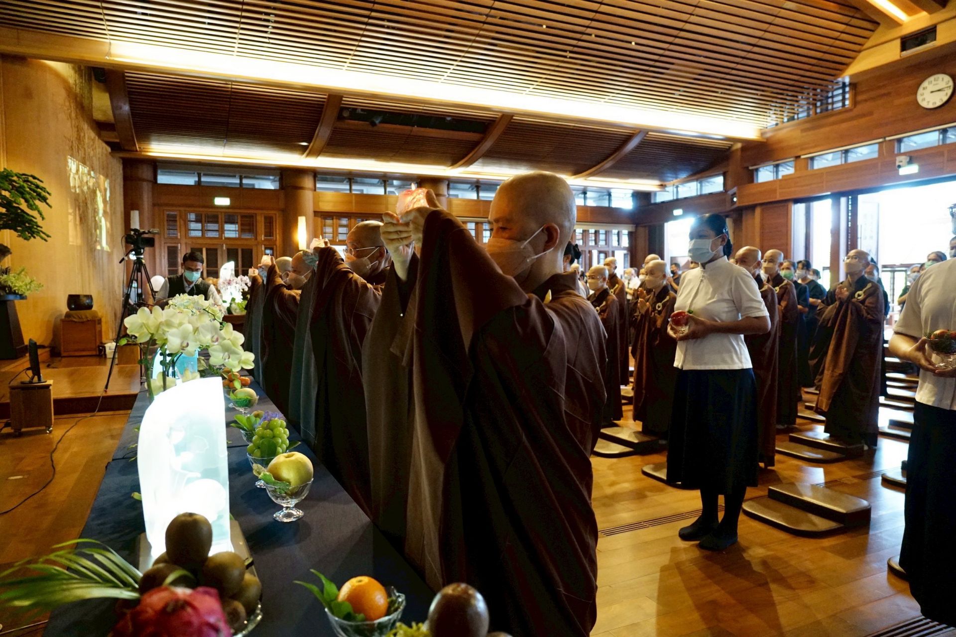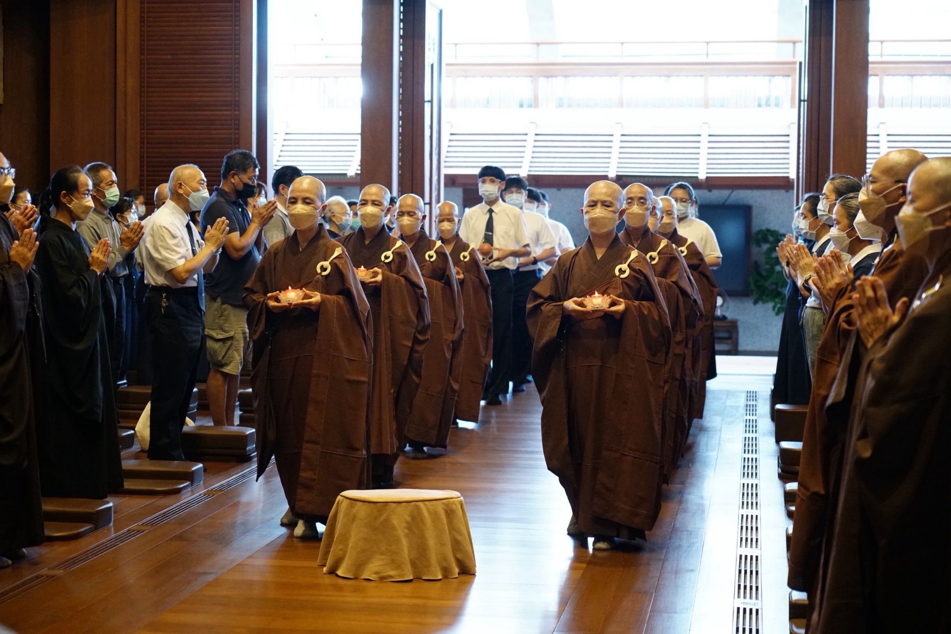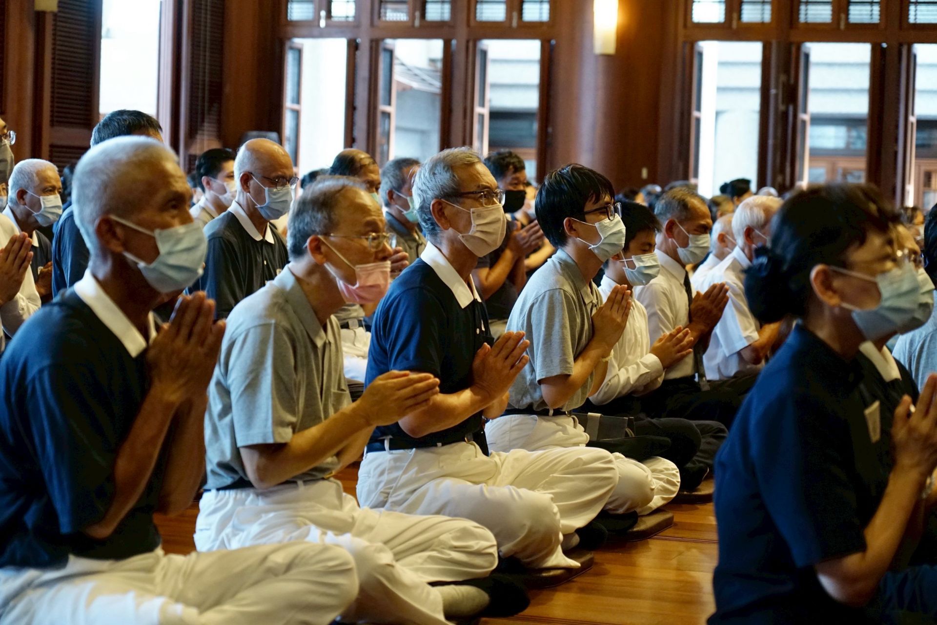 「爐香乍爇、法界蒙熏,諸佛海會悉遙聞,隨處結祥雲。誠意方殷,諸佛獻全身,南無香雲蓋菩薩摩訶薩…」9月20日下午三點,靜思精舍「七月吉祥月祈福會」結合靜思精舍例行晚課,法師們帶領全體以及線上共10個國家地區,從〈爐香讚〉開始,全體獻供、共同「禮拜八十八佛」,感念諸佛菩薩的恩澤,透過科技讓海內外慈濟會所同時祈福,祈禱人人平安、天下無災。