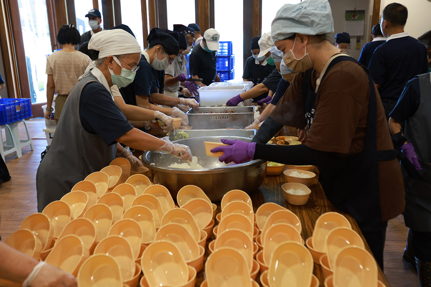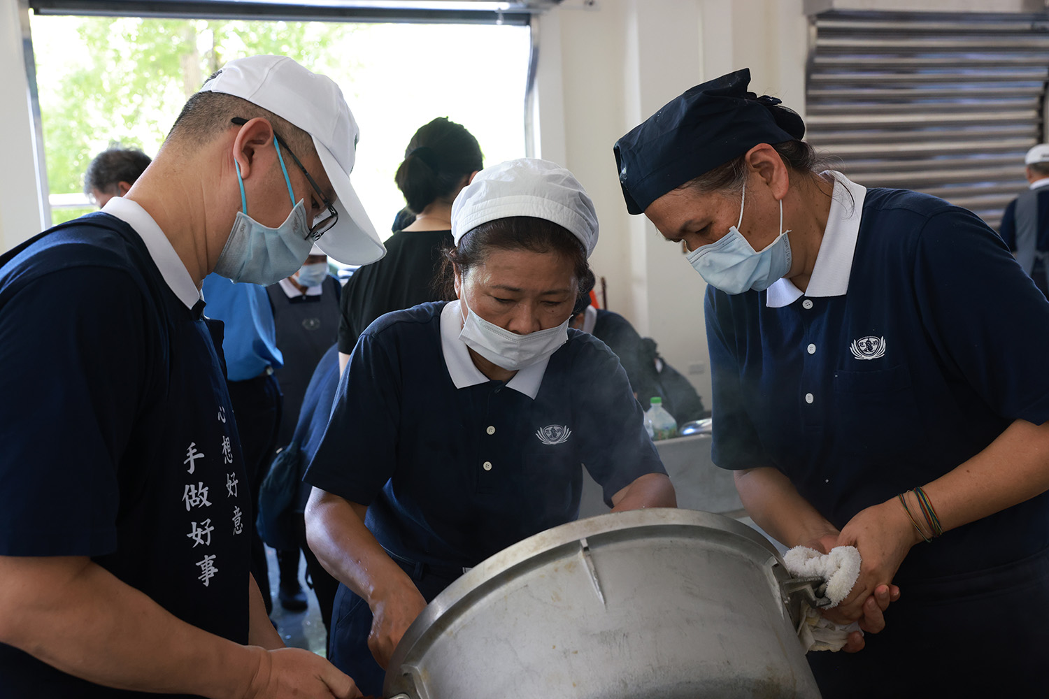 慈濟瑞穗共修處於去年落成,這次承擔中央廚房的重任,如何應付數千份便當的飯量,成了第一大考驗。「我們只有四口大電鍋,根本不夠煮!」志工蔡秀鳳回憶當時的焦慮。後來透過瓦斯行老闆的牽線,借到了其他道場的三口大鍋,終於能同時煮出七大鍋白飯,解決燃眉之急。