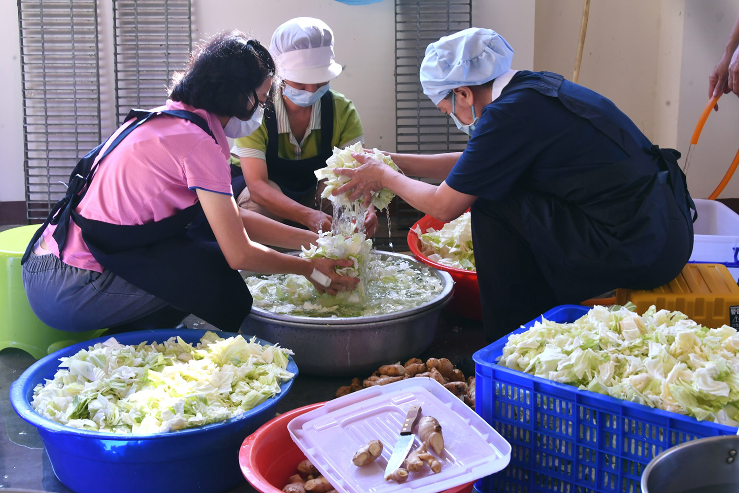 來自林口的王同學在連假與爸媽、阿姨到瑞穗探望長輩,也一同參與協助。她說:「今天切紅蘿蔔絲、也切高麗菜,平時在家沒有做過這樣的事,覺得很新鮮。」
