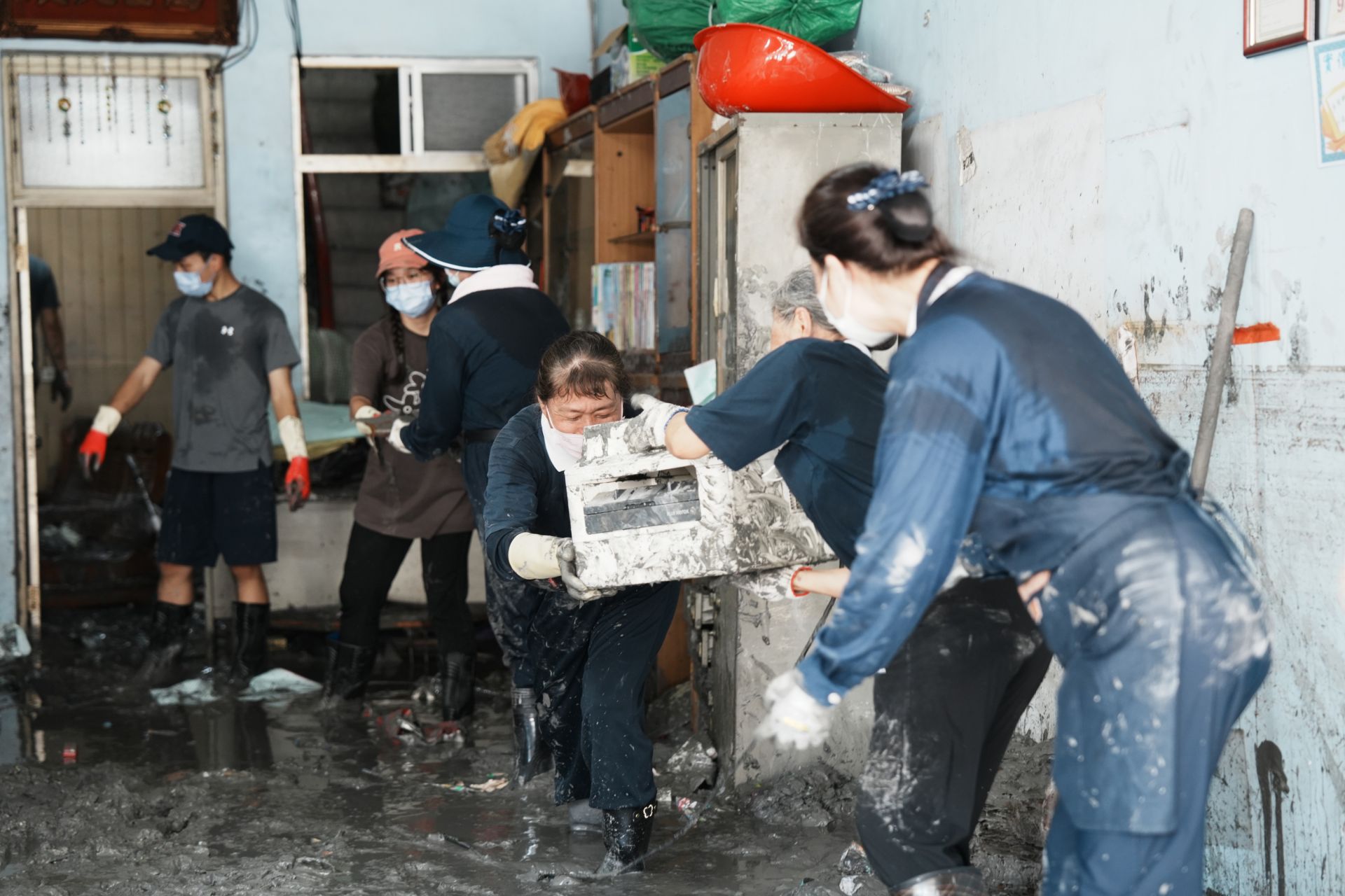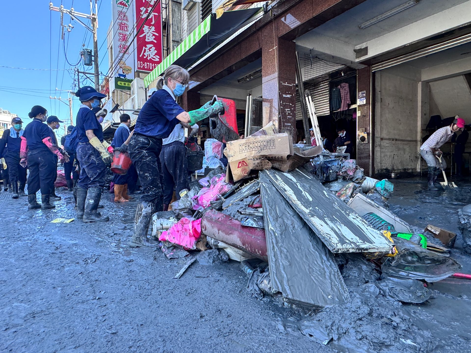 受災戶李女士經營烘焙店,溢流沖下的泥流從住家前後分別灌進,中秋節訂單的食料都報廢,所有機具與冷藏設備全部報銷。儘管維生工具受損,心裡難過,也是得繼續努力清理,原本自己預估得花1個月才能恢復,慈濟帶來人力與工具,搭配水車與堆土機,加速清淤效率,一天完成清淤作業。李女士表示,很感謝你們一大群人來幫我打掃,還幫我把東西搬出去,不然我一個人不知道要怎麼辦,真的衷心感謝。