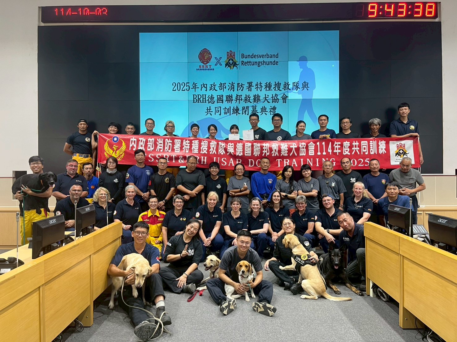 消防署特種搜救隊日前舉行「臺德搜救犬交流訓練」閉幕典禮,為期五5天的課程順利完成。本次訓練邀請德國聯邦救難犬協會(Bundesverband Rettungshunde e.V., BRH)第二副主席Mrs.Ulrike Gehner 率領12名教官來臺,共有來自各縣市消防機關與民間團體的 42 組學員與犬隻參加,訓練重點放在「瓦礫搜索」與「路徑追蹤」兩大領域。