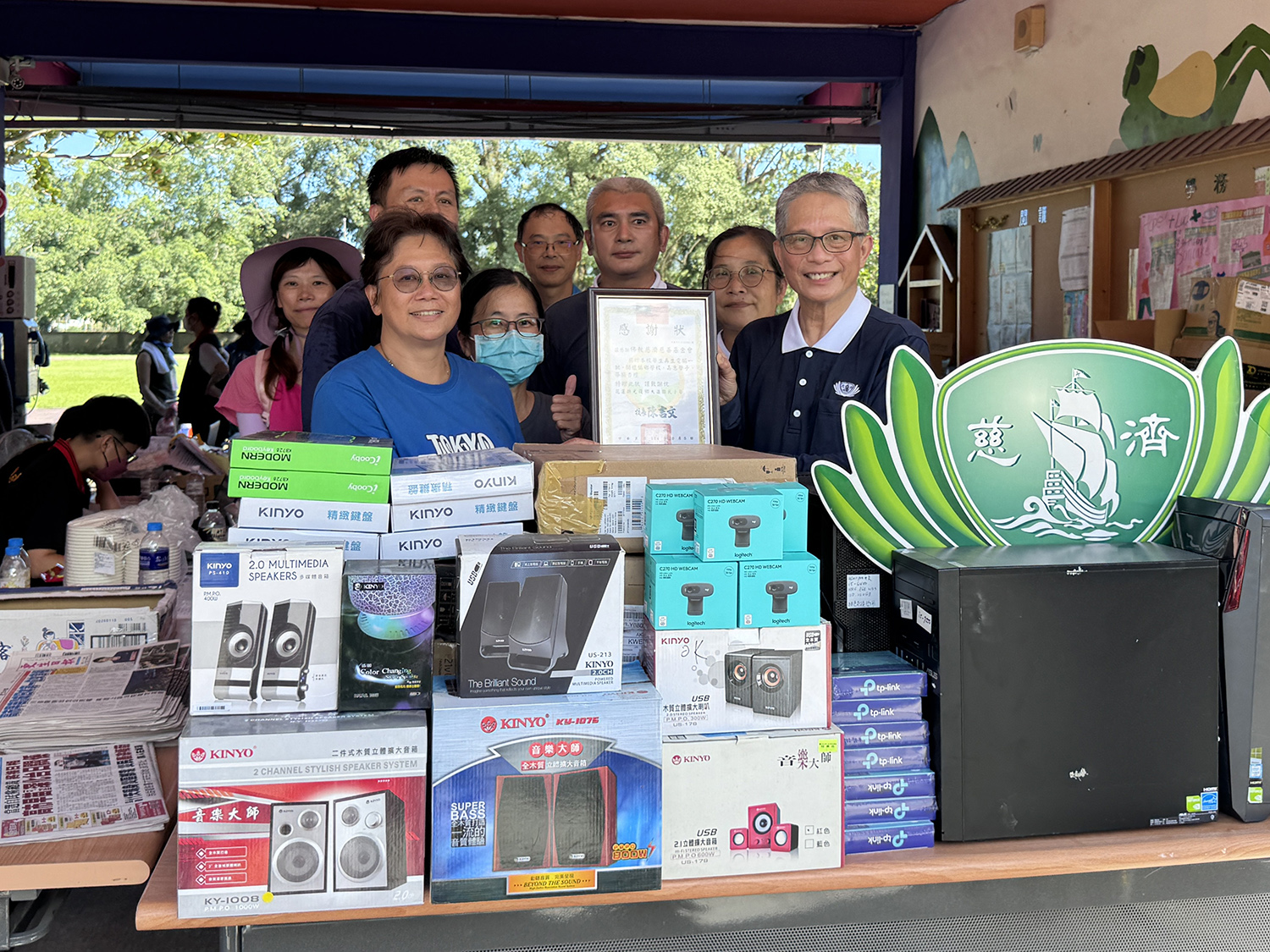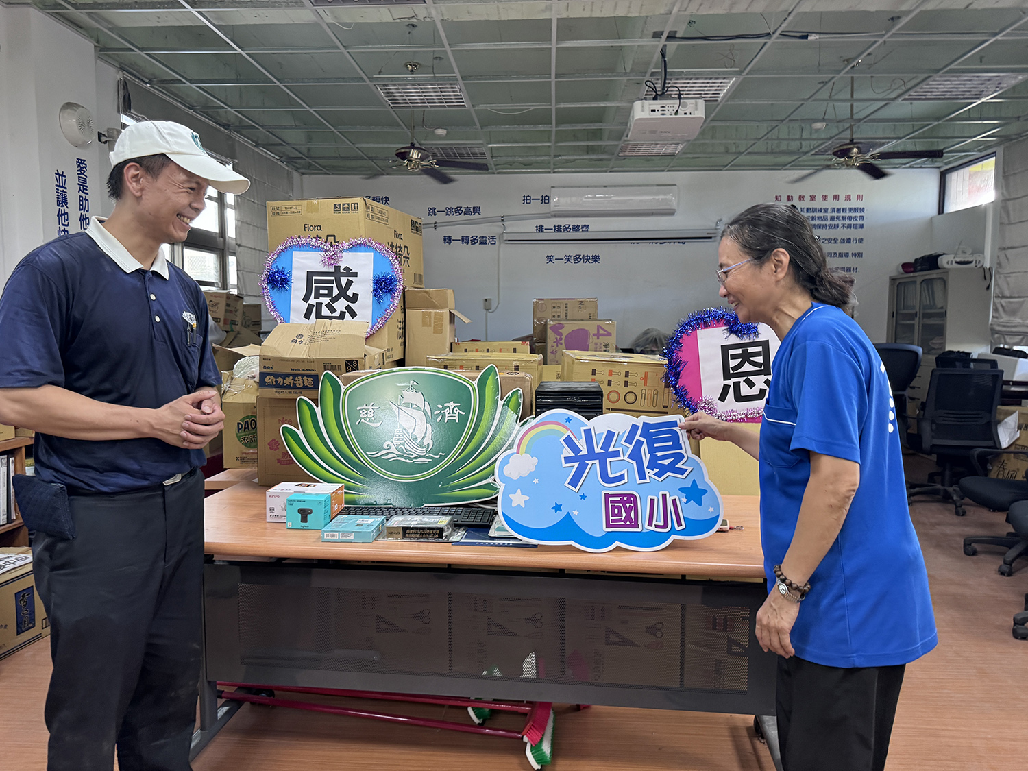 馬太鞍堰塞湖溢流造成光復鄉多處災情,其中有許多學生與校園的資訊設備受損,慈濟10月5日捐贈4個學校共144組再生電腦及全新周邊配備到光復災區學校,提供大進國小、光復國小、太巴塱國小、西富國小的學生,讓學子的學習不中斷。另外,九乘九文具透過慈濟捐贈一批書包文具到災區3所學校,希望讓學童復學前能有充足準備。光復國小黃彤芳校長說:「有了這一套他們(學生)就會比較安心。」