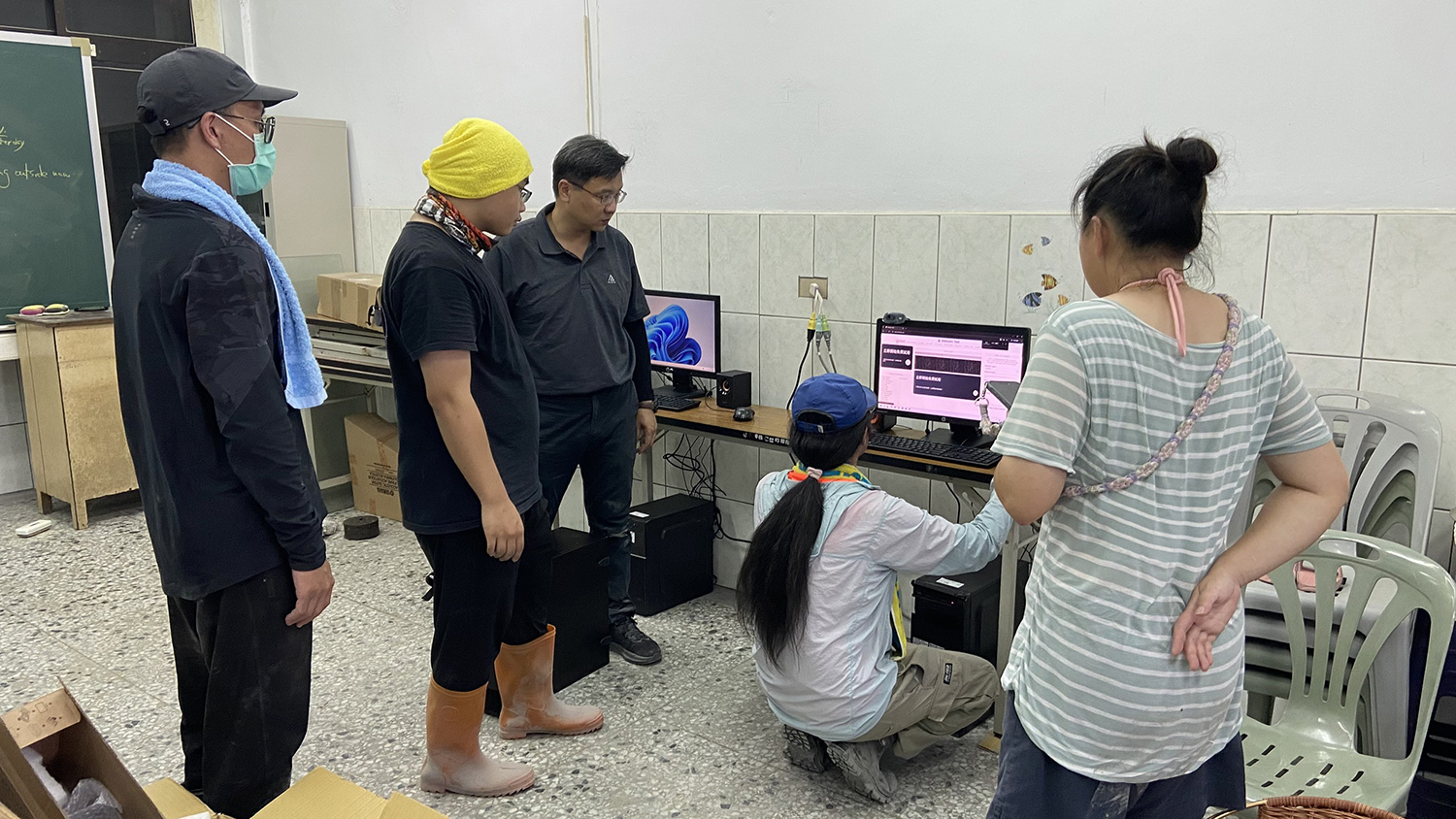 志工將設備帶到家戶安裝、教學。林媽媽表示,災後第3天孩子就一直問:什麼時候可以回學校,現在有電腦就可以透過線上學習。光復國小黃彤芳校長說:我們的小朋友一定會很開心,這樣一整組他只要有電,不管是線上學習、做作業,都很方便。