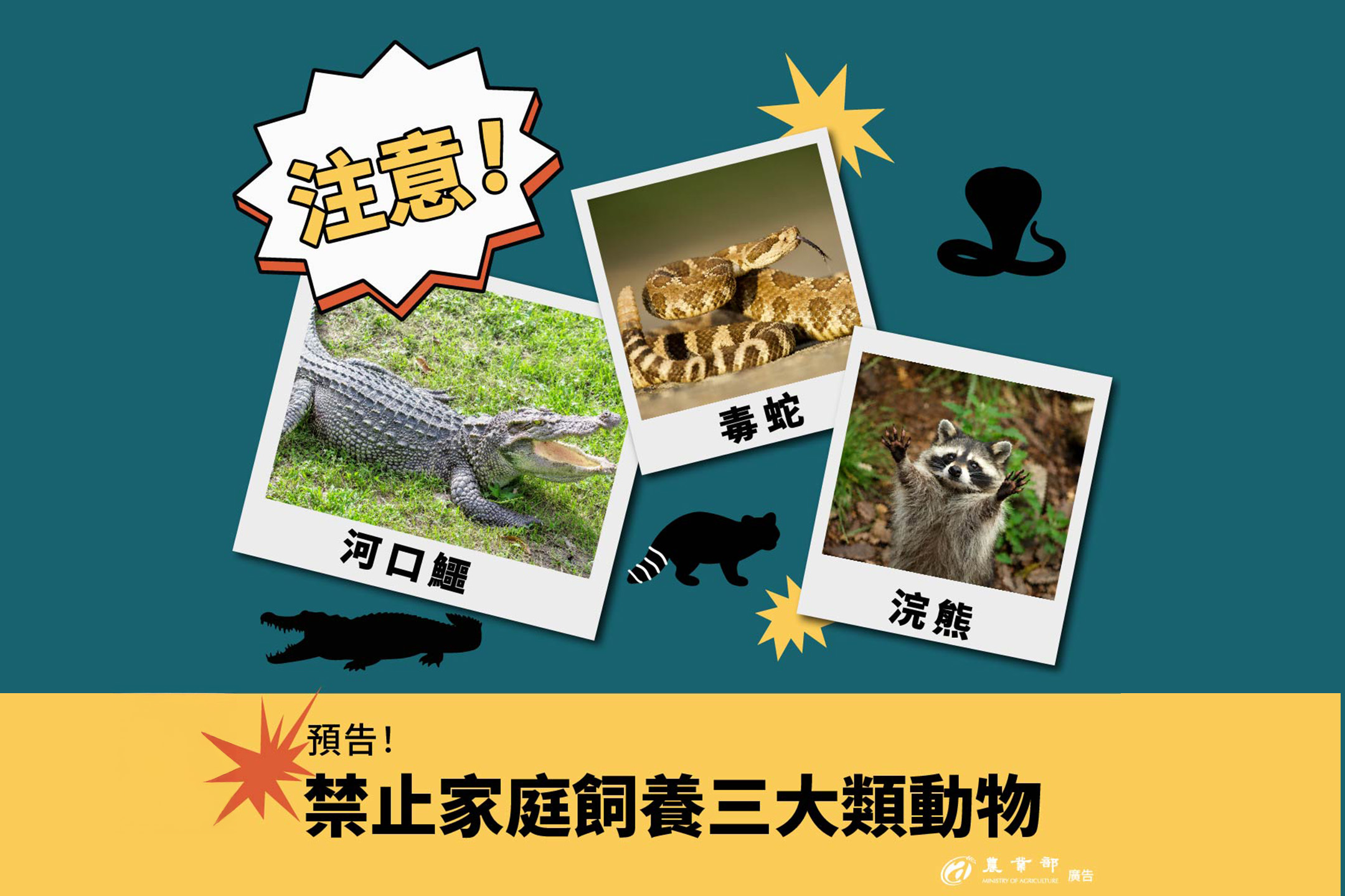 為維護公共安全及保障國人生命安全,農業部8日依據《動物保護法》第8條規定,預告「指定禁止飼養輸入或輸出之動物」修正草案,將禁止一般家庭民眾飼養641種具劇毒或高攻擊性動物,包含蝮蛇科、蝙蝠蛇科、浣熊及河口鱷等,本次預告期間為30日。