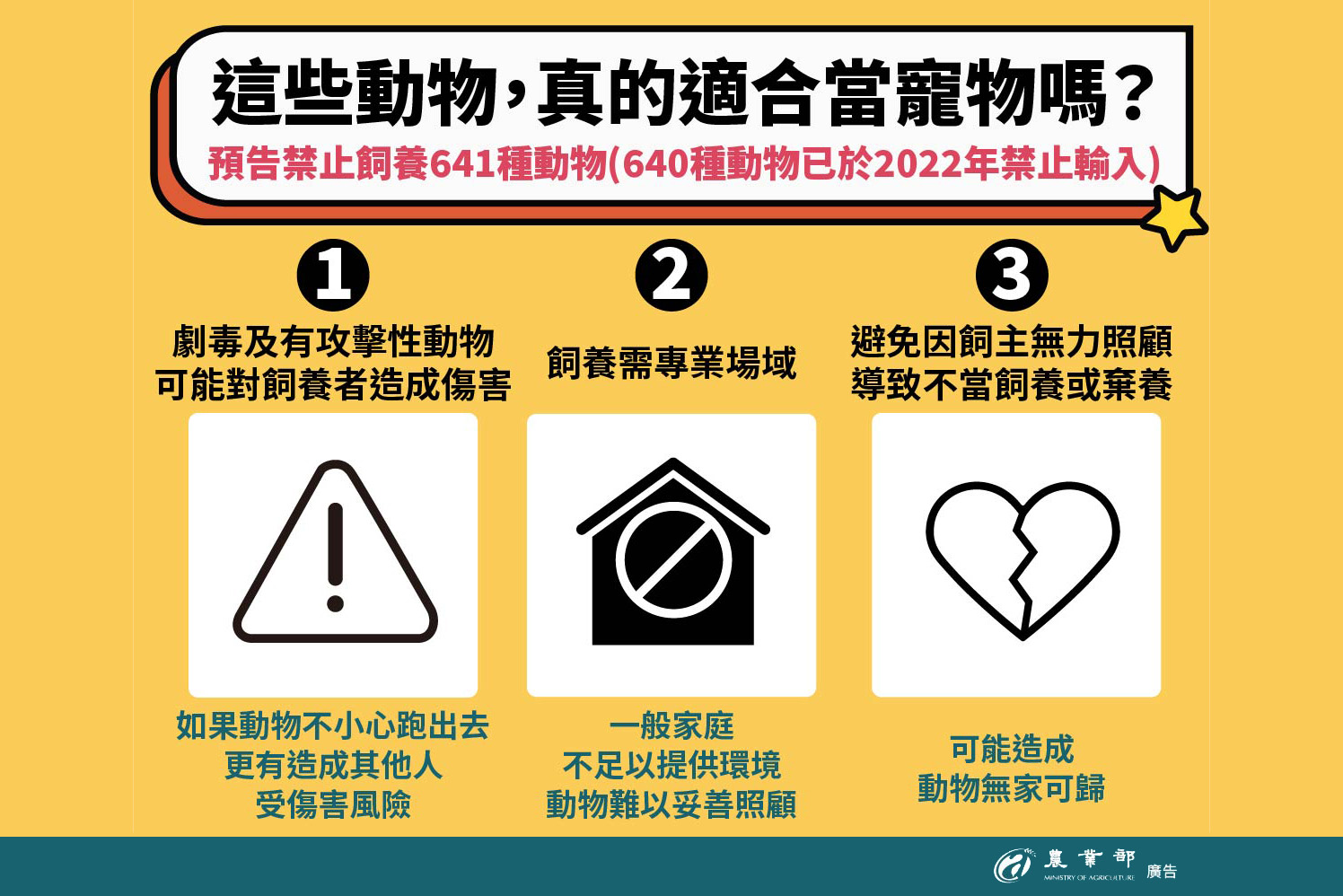 農業部說明,本次預告禁止飼養的641種動物,除河口鱷外,共計有640種為111年起已公告禁止輸入的動物,且是農業部自114年1月起,歷經4次利害關係人會議審慎討論後所達成的共識。禁止飼養的主因在於這些動物多數具有劇毒性,且國內無相關血清可用,或本身具有高度攻擊性,一旦棄養或逸失,將嚴重威脅公共安全。因此,為強化源頭管理及保障人畜安全,必須針對此類具高風險的動物進行飼養管制。