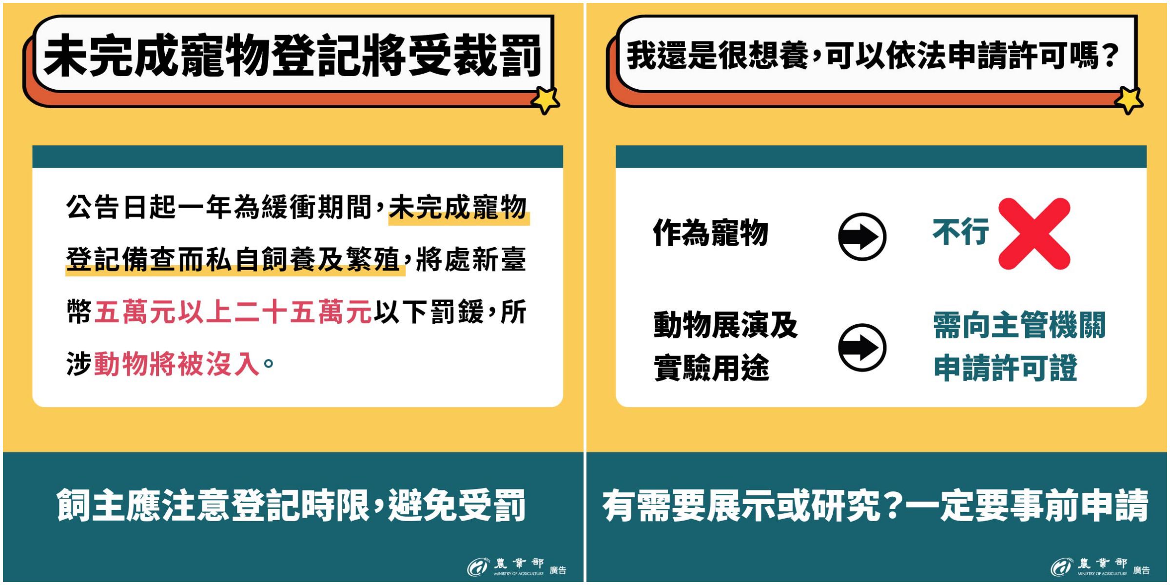 農業部將持續精進我國寵物的分類分級管理制度,並呼籲民眾於飼養動物前,應審慎評估自身環境、能力與責任,擇定合適且有辦法提供良好照護的寵物進行飼養。動物一旦成為家庭成員,飼主應負起最大責任,提供良好環境,並恪守「終養不棄養」的承諾,共同為提升我國動物福利與公共安全而努力。
