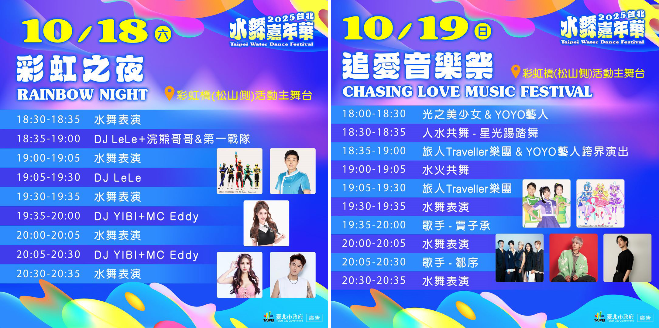 「2025台北水舞嘉年華」最終場活動「追愛音樂祭」,將於10月19日重磅登場,臺北市政府觀光傳播局表示,當天限定版「人水共舞」與「水火共舞」展演將華麗再現,多組人氣表演團體也齊聚彩虹橋河畔,共度最浪漫的秋夜;10月18日登場的主題活動「彩虹之夜」,更有嗨翻全場的金曲拼盤以及卡通IP「第一戰隊」演出,邀請民眾把握最後一週前來觀賞,感受水岸的熱力與精采。