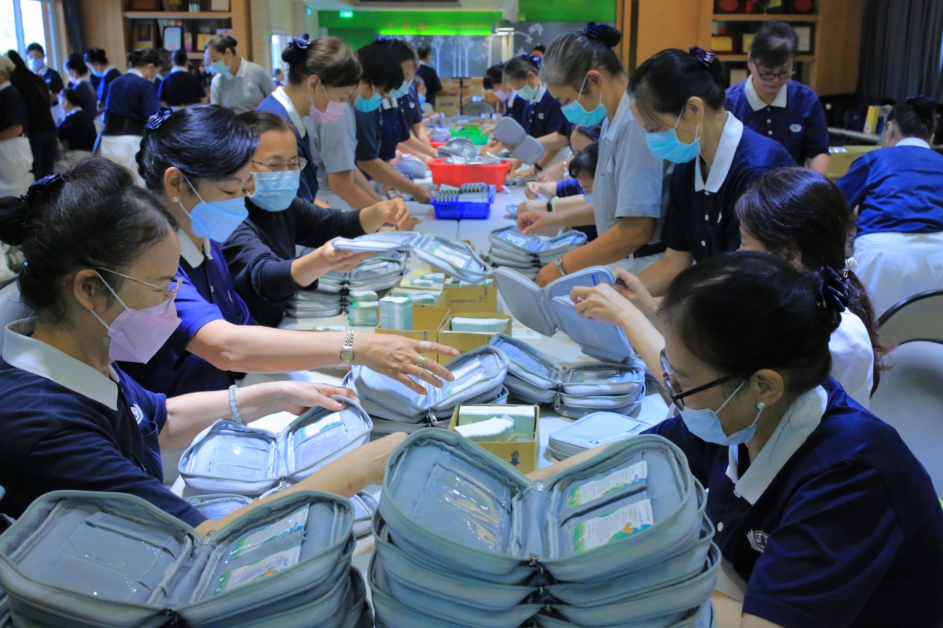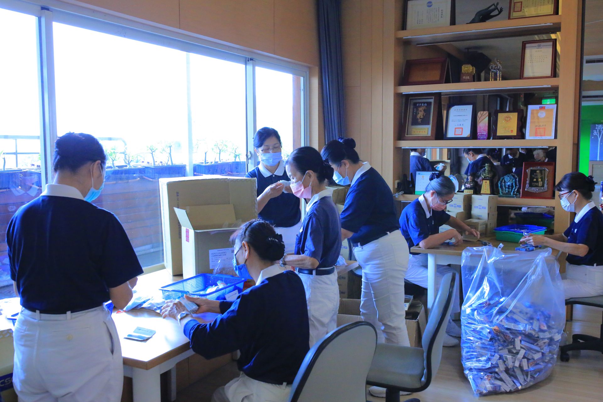 志工迅速主動就動線位置,從拆包裝盒、插卡、放藥膏、說明書至裝箱,大家安住各自的崗位,以三個小時的時間完成組裝工作。