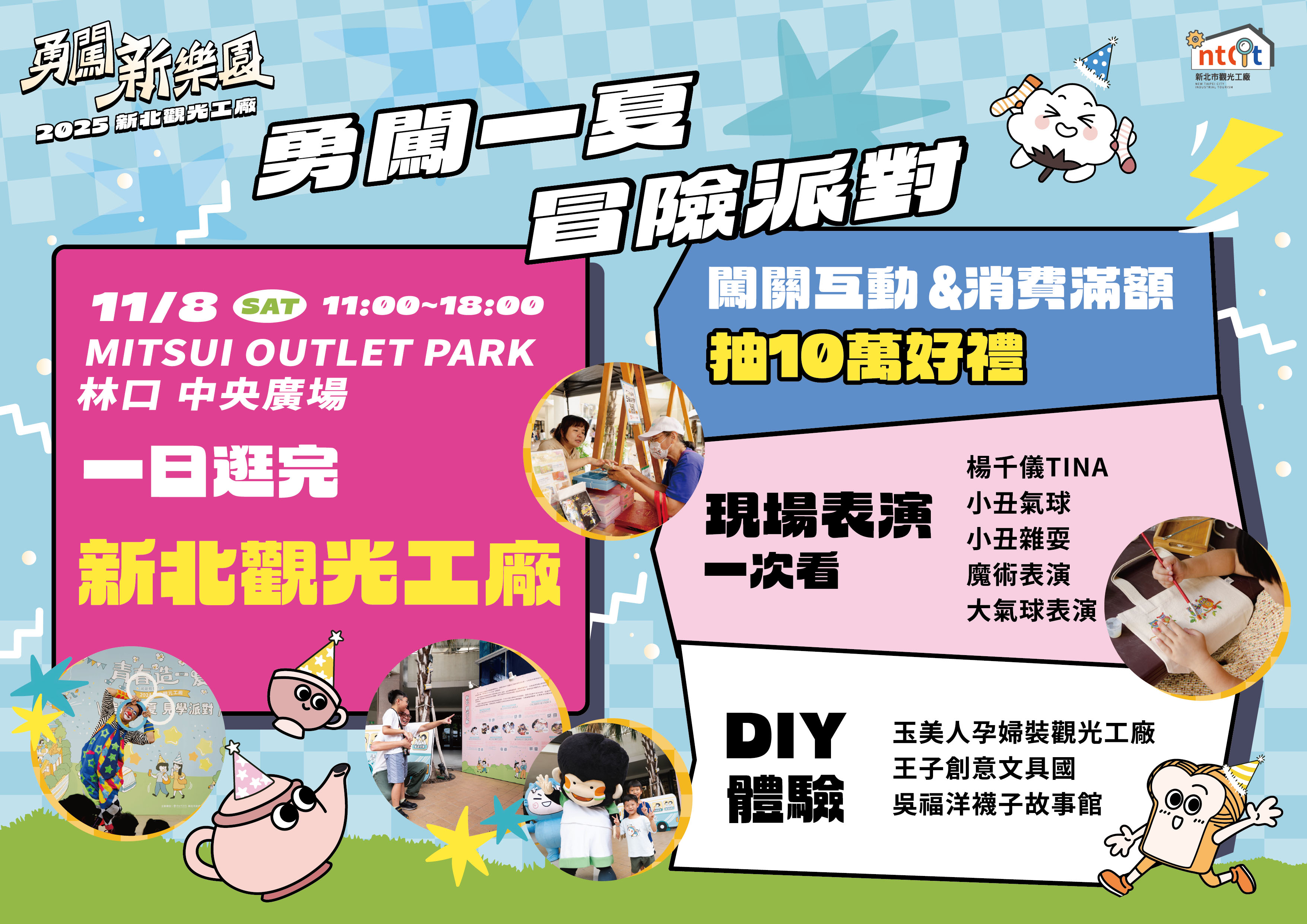 2025新北觀光工廠年度盛會「勇闖一夏 冒險派對」將於11月8日(六)在MITSUI OUTLET PARK林口中央廣場熱鬧登場!活動集結14家新北觀光工廠與產業文化館共同參與,打造兼具娛樂、體驗與探索的產業派對。現場規劃觀光工廠市集、趣味舞台表演、滿額與集點抽獎、DIY手作體驗、職涯探索特展區及觀光工廠問答挑戰等六大主題內容,邀請大小朋友一同來闖關冒險,體驗新北產業的無限創意與魅力。
