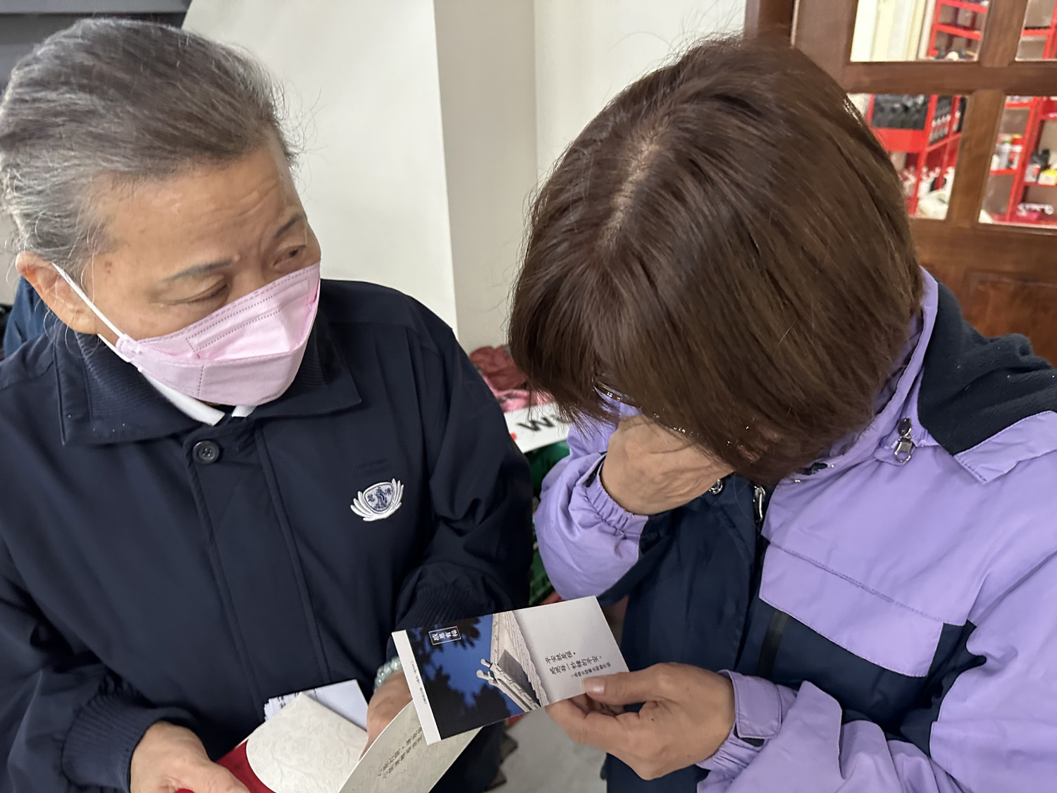 住在蘇北里的黃先生經營汽車修理廠,他表示店面剛貸款建好這次又逢大水淹過,還好一家人都平安。黃先生還保留15年前梅姬風災後,慈濟給予關懷的證嚴法師慰問信,這次再受到慈濟的關懷,黃太太唸著祝福卡上的文字,忍不住落淚,夫妻兩人一直道感恩。