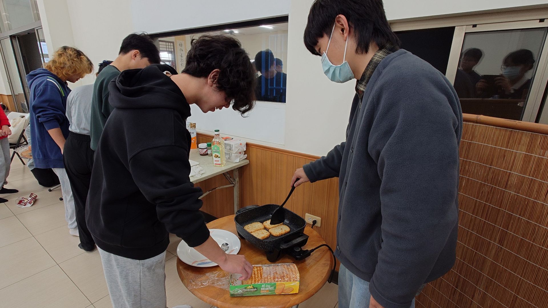 志工張惠玲除了介紹環保站及回收分類,也向學生推廣蔬食。她指出,傳統素食較難吸引年輕人,因此特別準備風味清新的蔬食料理,並讓學生親手做餐點,同學大多第一次下廚,雖生澀但很認真,有的切蕃茄、芭樂、柳丁等水果,有的煎荷包蛋、薯餅,搭配泡菜、素香鬆、起司等,一個個令人食指大動的美味蔬食漢堡完成,她也鼓勵同學多蔬食,「一餐的素食可減少760克碳排放量」。