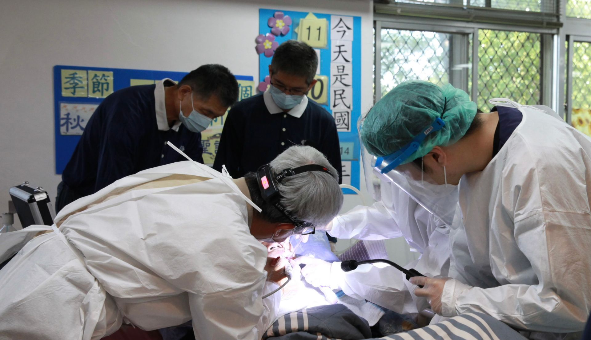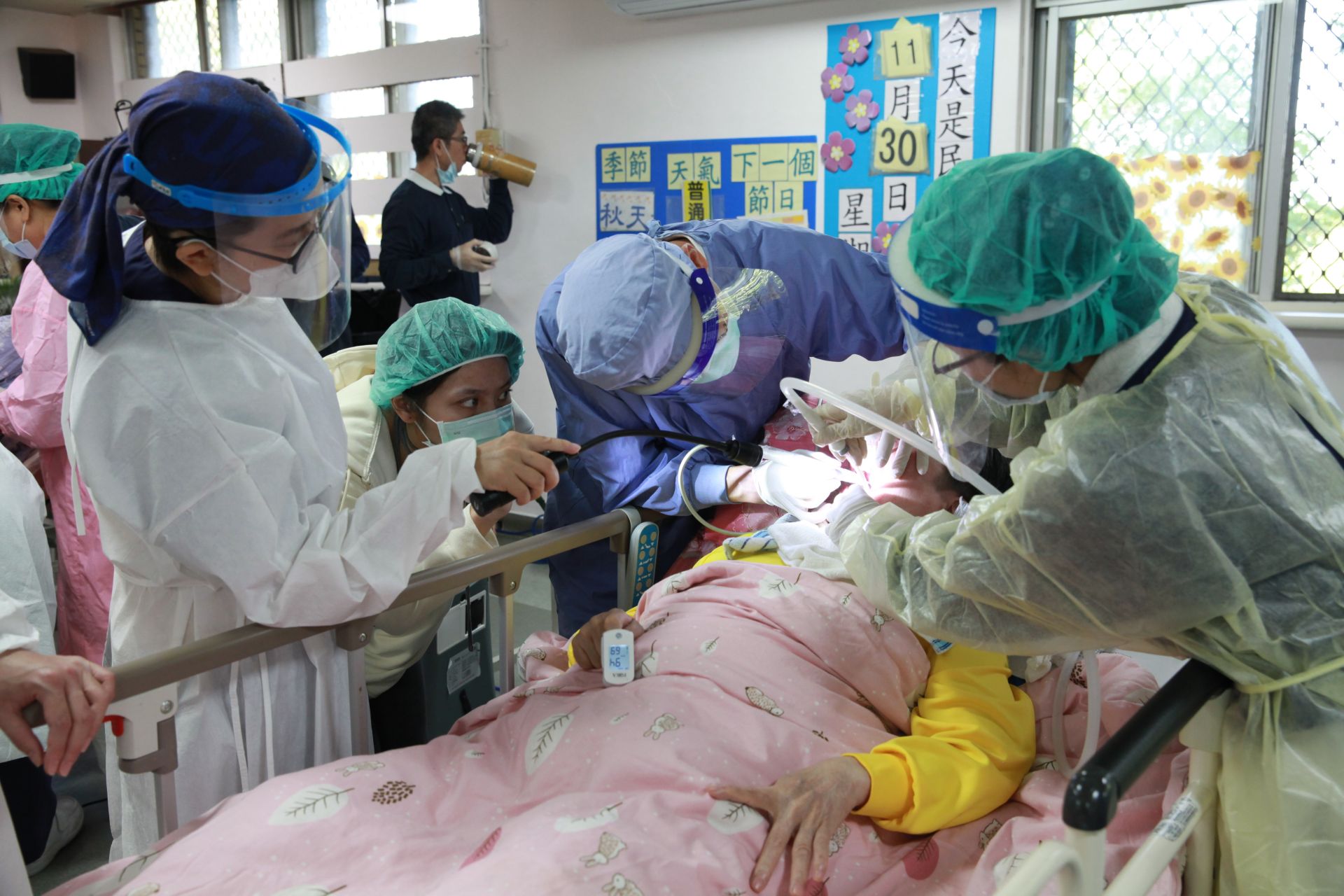 活動現場規劃四台活動洗牙機,每一台都安排五位成員。主治的牙醫、牙助、志工和二位養護中心人員,隨時觀察長者洗牙時手上血氧機狀況。