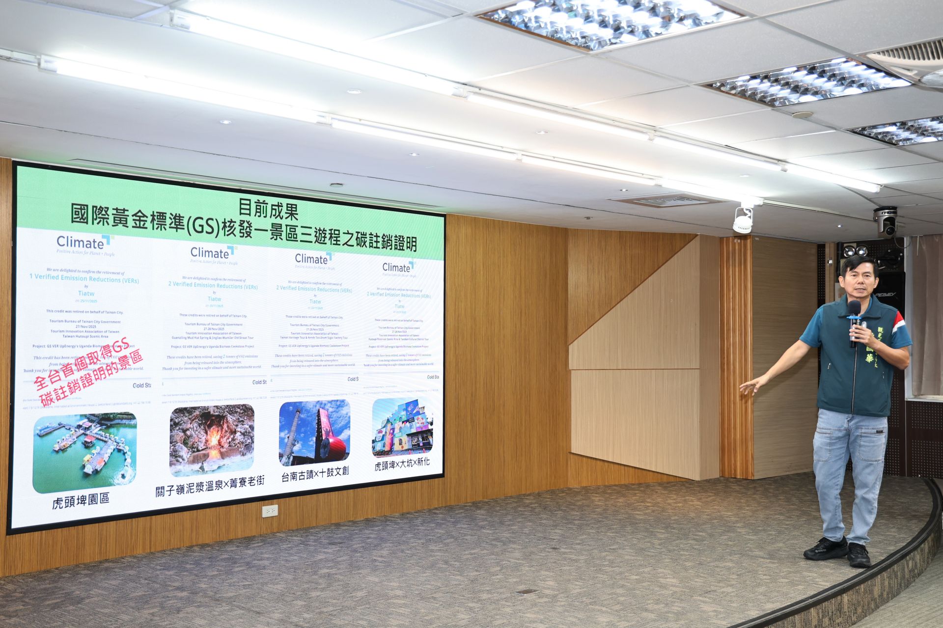 台南市政府3日於永華市政中心召開記者會,發表三條全新低碳旅遊遊程,為永續旅遊再創新里程碑,同時宣布虎頭埤風景區完成全台首例「景區旅客碳足跡計算」,並取得國際黃金標準(Gold Standard)碳註銷證明,代表台南永續旅遊成果正式與國際接軌。