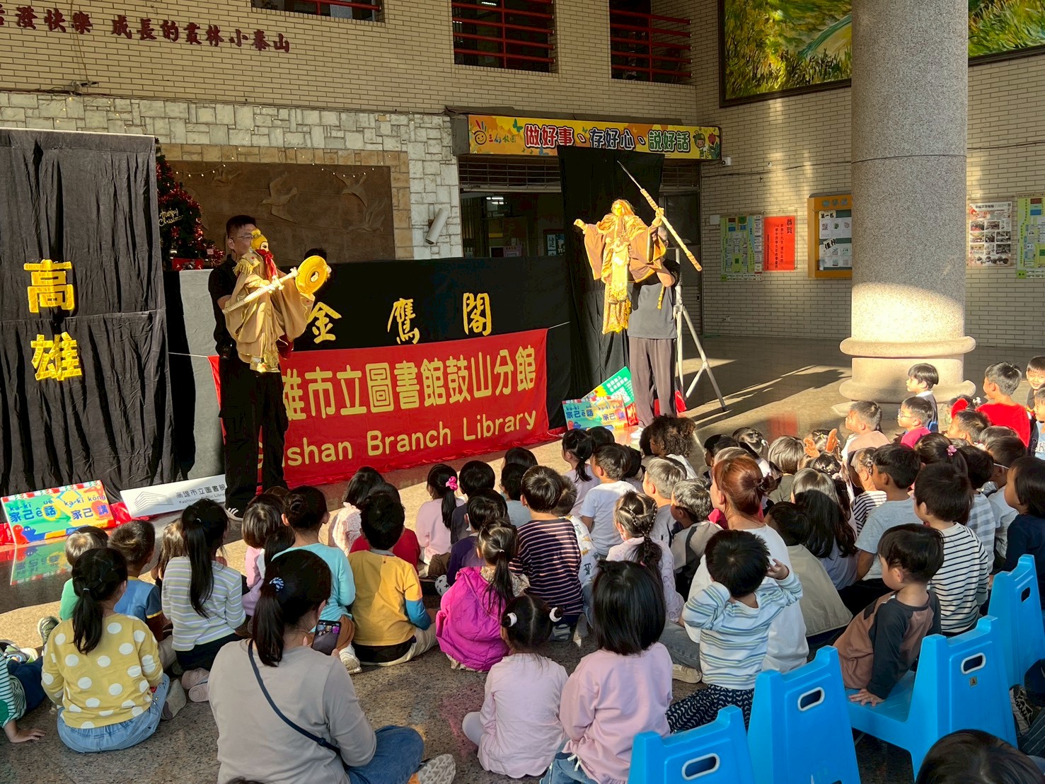 鼓山圖書館 12月12日召集細漢囝仔作伙「入棚尬台語」,特別邀請南臺灣赫赫有名的「金鷹閣電視木偶劇團」跨區楠梓翠屏非營利幼兒園,帶來熱鬧滾滾、鑼鼓聲陣陣的主題式互動布袋戲《跟著偶來學臺語、跟著偶來逞英雄》。金鷹閣團長陳皇寶領軍上陣,以十三年高雄市傑出演藝團隊的氣勢,讓校園彷彿瞬間變成小小戲棚,將台灣布袋戲文化的精隨,用最親民、最可愛的方式扎根在孩子心中。