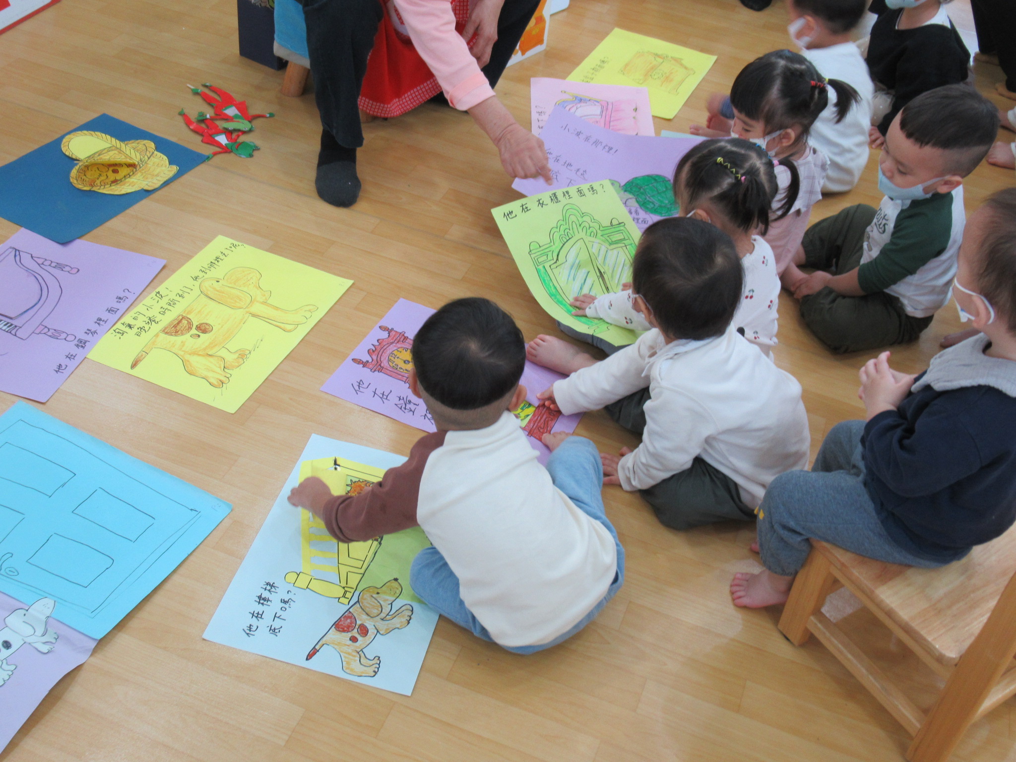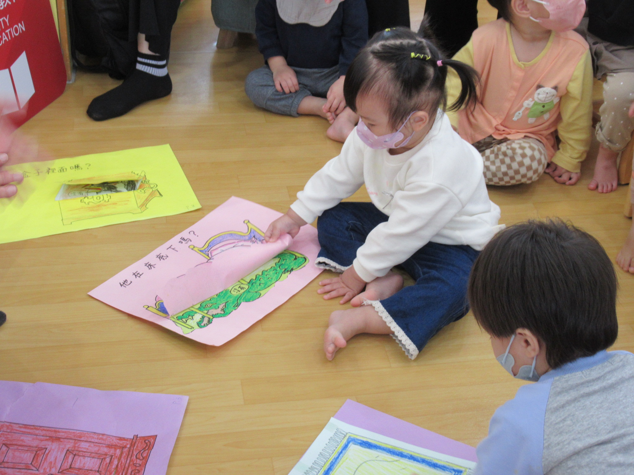 導讀過程中,幼兒專注觀察摺頁變化,對翻開後出現的動物角色表現驚喜,並安排親自操作繪本,透過動手翻閱與尋找角色,強化感官刺激,促進手眼協調與認知發展。