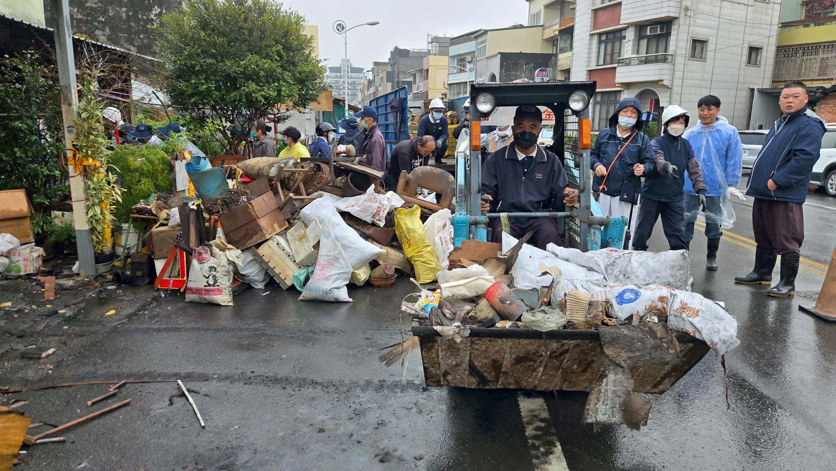 慈濟訪視志工王麗玉表示,火災發生後我們前往關懷與場勘災情,經了解房子嚴重燒燬,可能要做一番清理的工作,所以組隊就決定動員40位師兄姊來進行協助清理,也請經營工程的志工開著小山貓機具,協助處理廢棄物發揮莫大效率,洪里長也加入清掃行列,其家人也在路旁協助疏導交通。