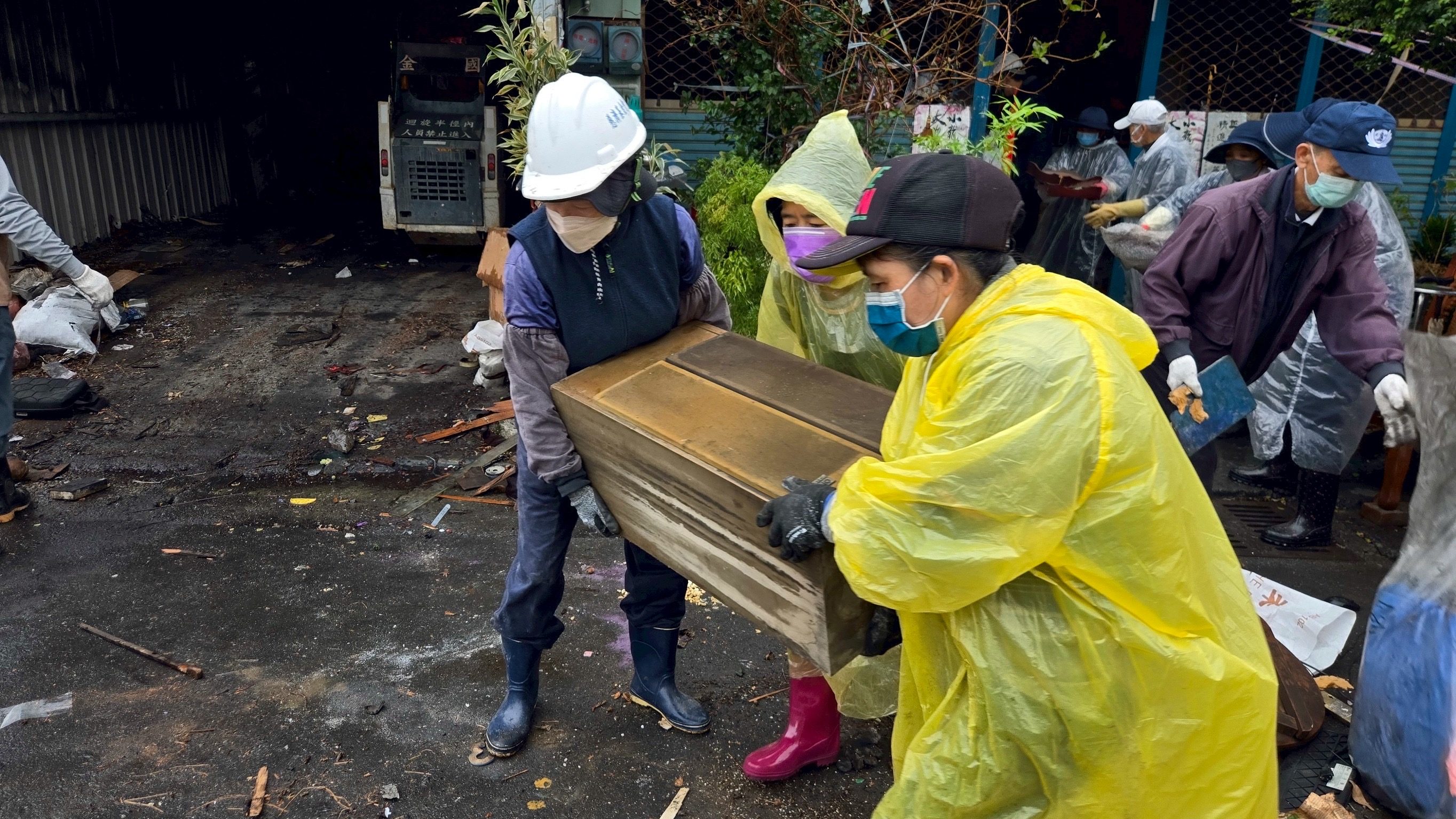志工們合和互協,約2小時半的時間,在大家的攜手同心之下終於完成任務,雖然人人都已被細雨淋濕,但看到住戶安心的笑容,也洗滌了一身的疲累。
