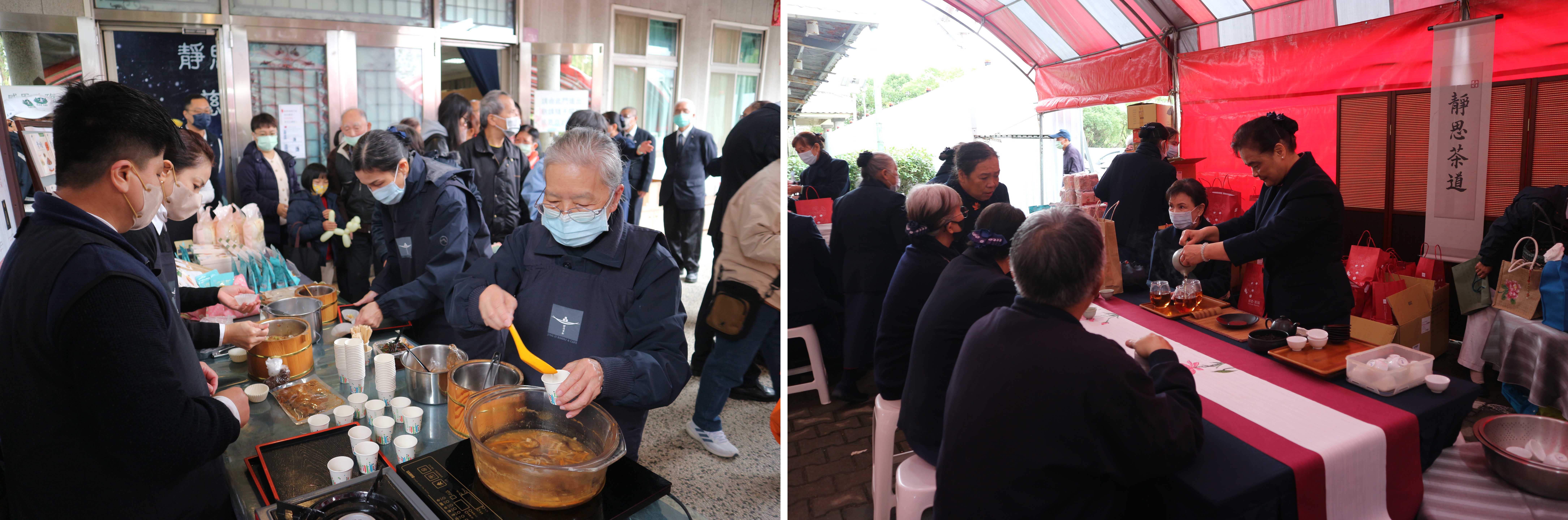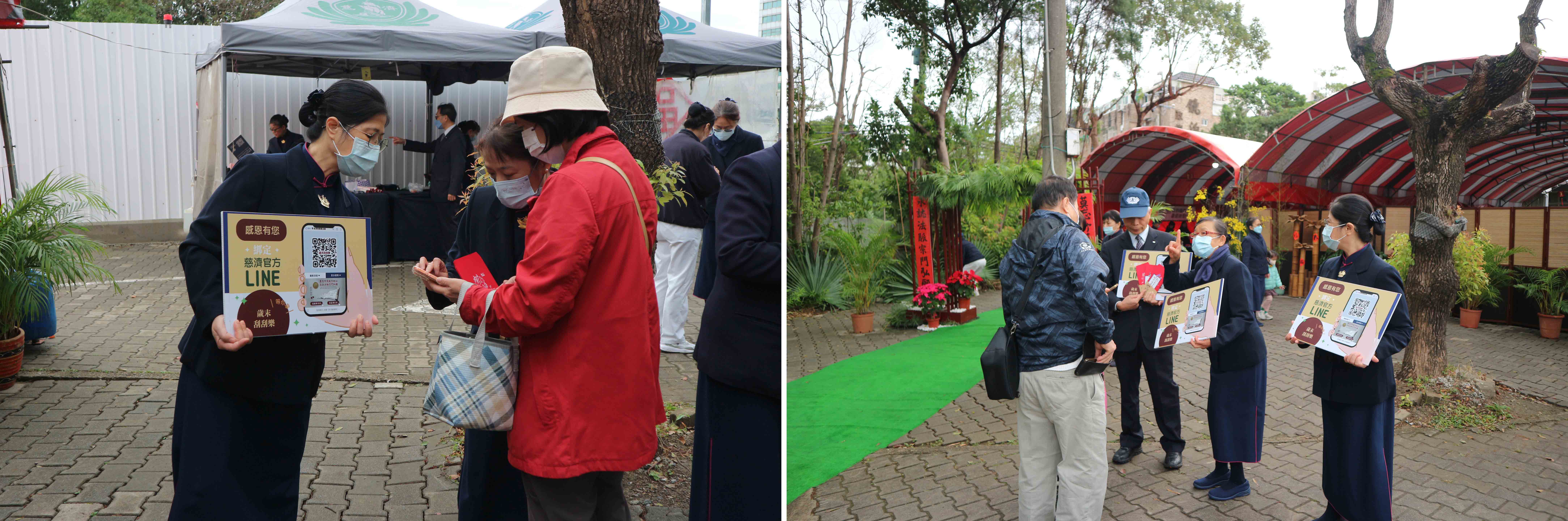 慈濟志工還在外場規畫多個攤位,當參加完內場的活動後,志工於出口處先奉上小點及小杯熱湯,讓大家先暖暖胃,之後再前往餐廳享用志工準備的平安餐;今年邀約了中壢分局的波麗士大人前來進行反詐騙宣導,或是到靜思茶道的茶席歇歇腳,由志工為您奉茶,還有擅長造型氣球的志工當場製作造型氣球與小朋友結緣,想讓慈濟的訊息不漏接?邀您加入慈濟基金會LINE好友,現在還有期間限定刮刮樂活動,能將滿載祝福的小禮帶回家。