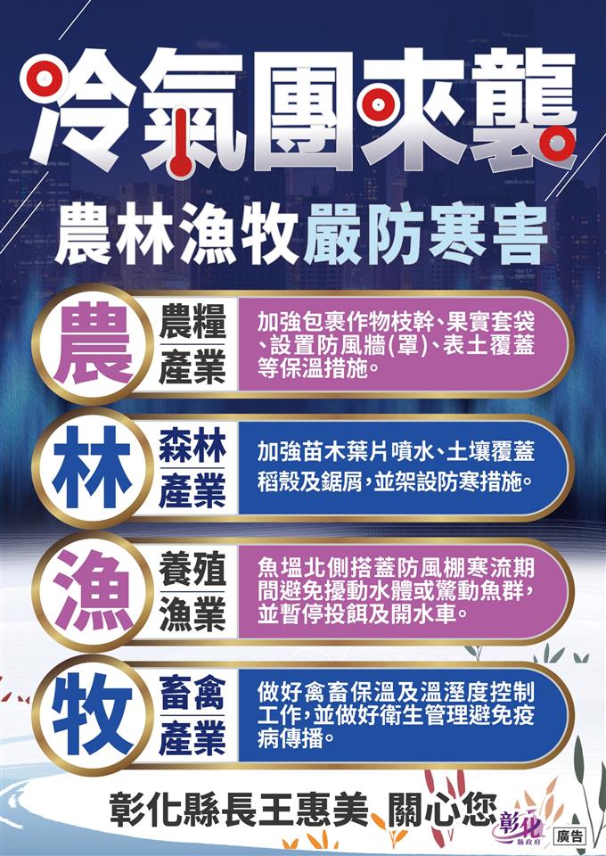 依據中央氣象署資料,本周受強烈大陸冷氣團影響,氣溫下降明顯,農漁養殖業需特別注意發生寒害的可能性,應嚴防寒害。彰化縣長王惠美特別呼籲農友注意自身保暖,採取農作物防寒措施,減少農作物災害及財產損失。