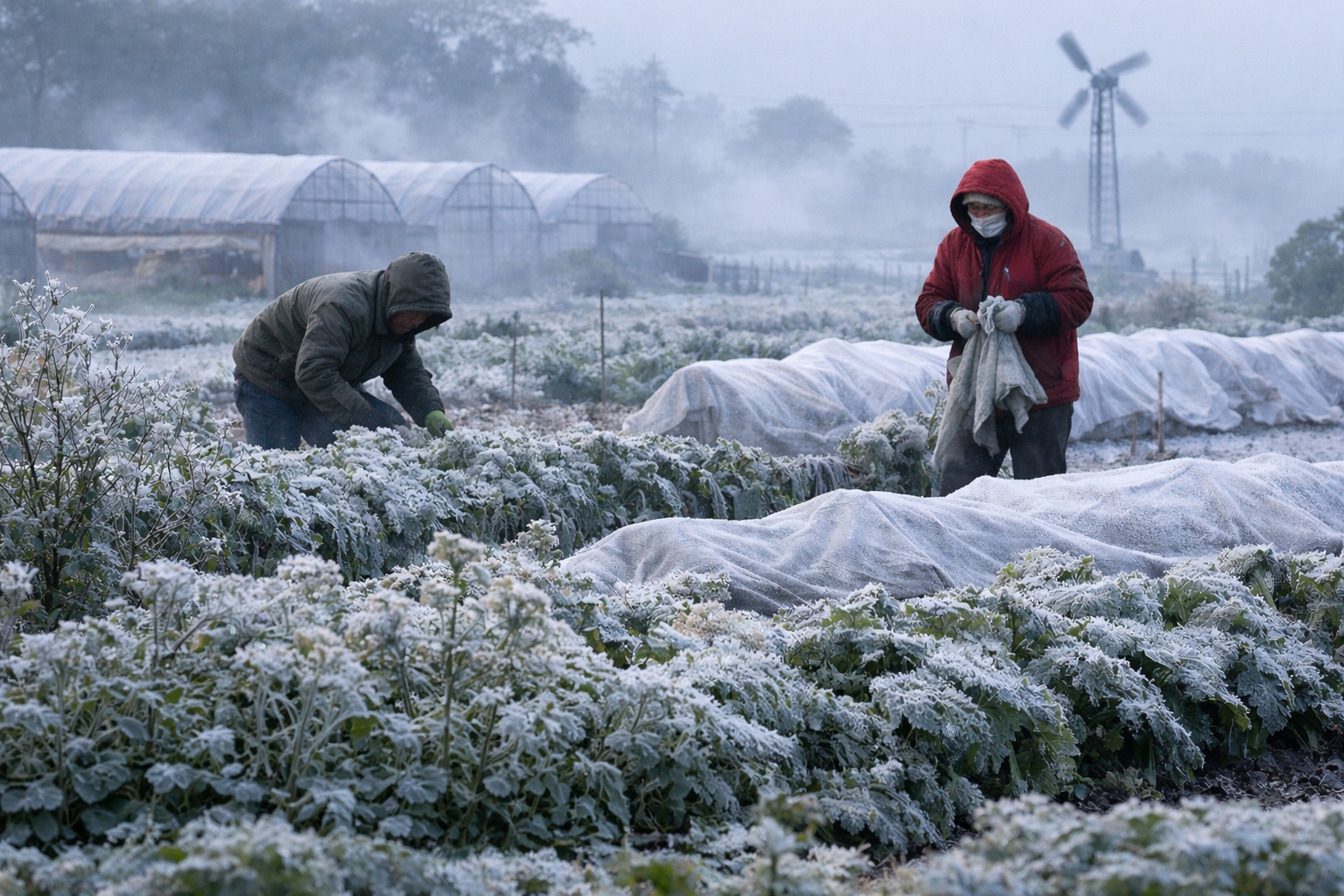 針對較不耐寒蔬菜與瓜果類,應設置防風牆、防風罩、塑膠布,或選用稻草、不織布直接覆蓋,並採畦溝灌溉方式,以達保溫防寒效果;花卉部分,除搭設塑膠棚溫室等設施加強保護外,可採畦溝灌溉或以塑膠布直接覆蓋,以達保溫防寒效果,並可酌量增施鉀肥,以增加耐寒力。