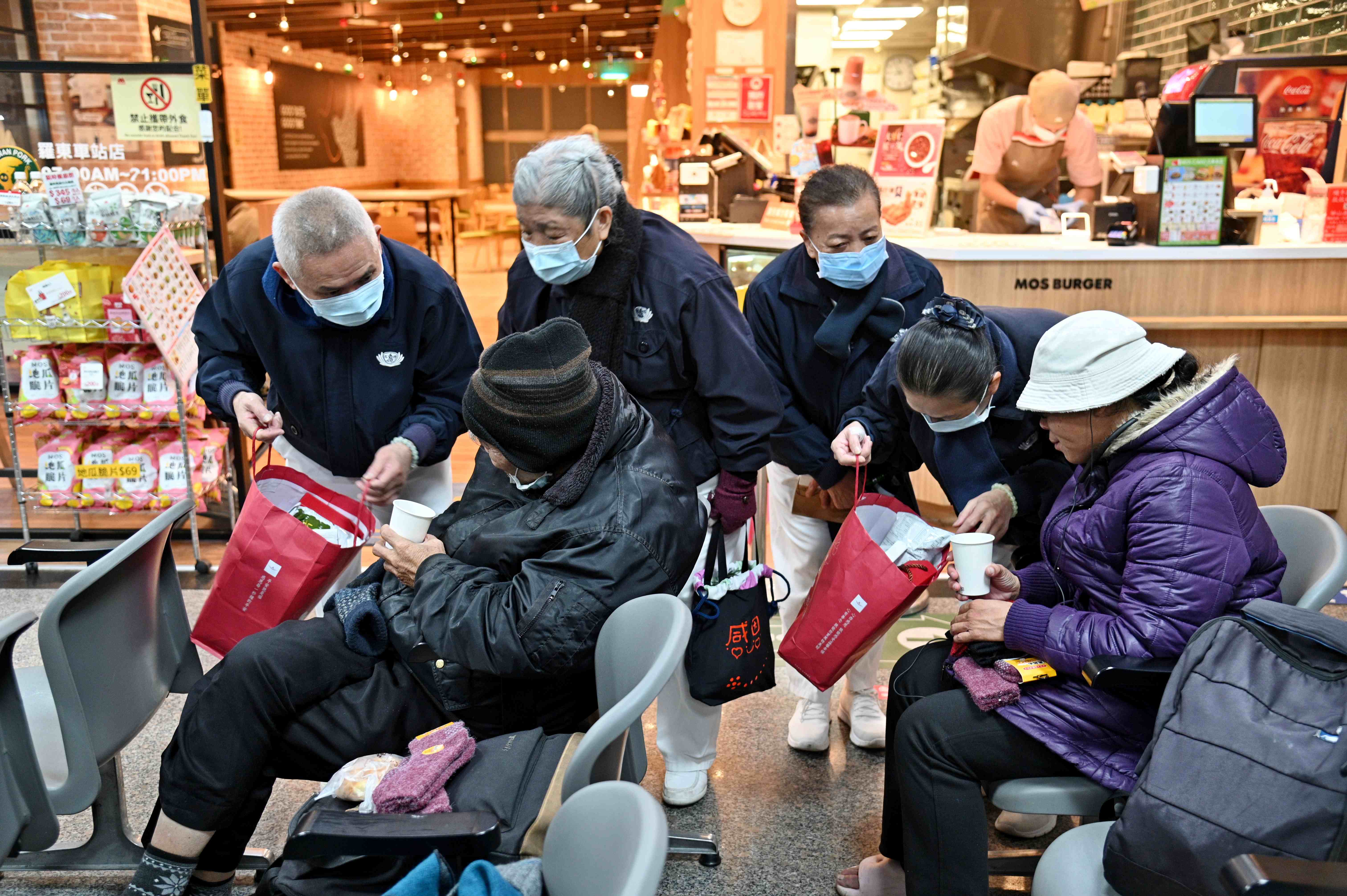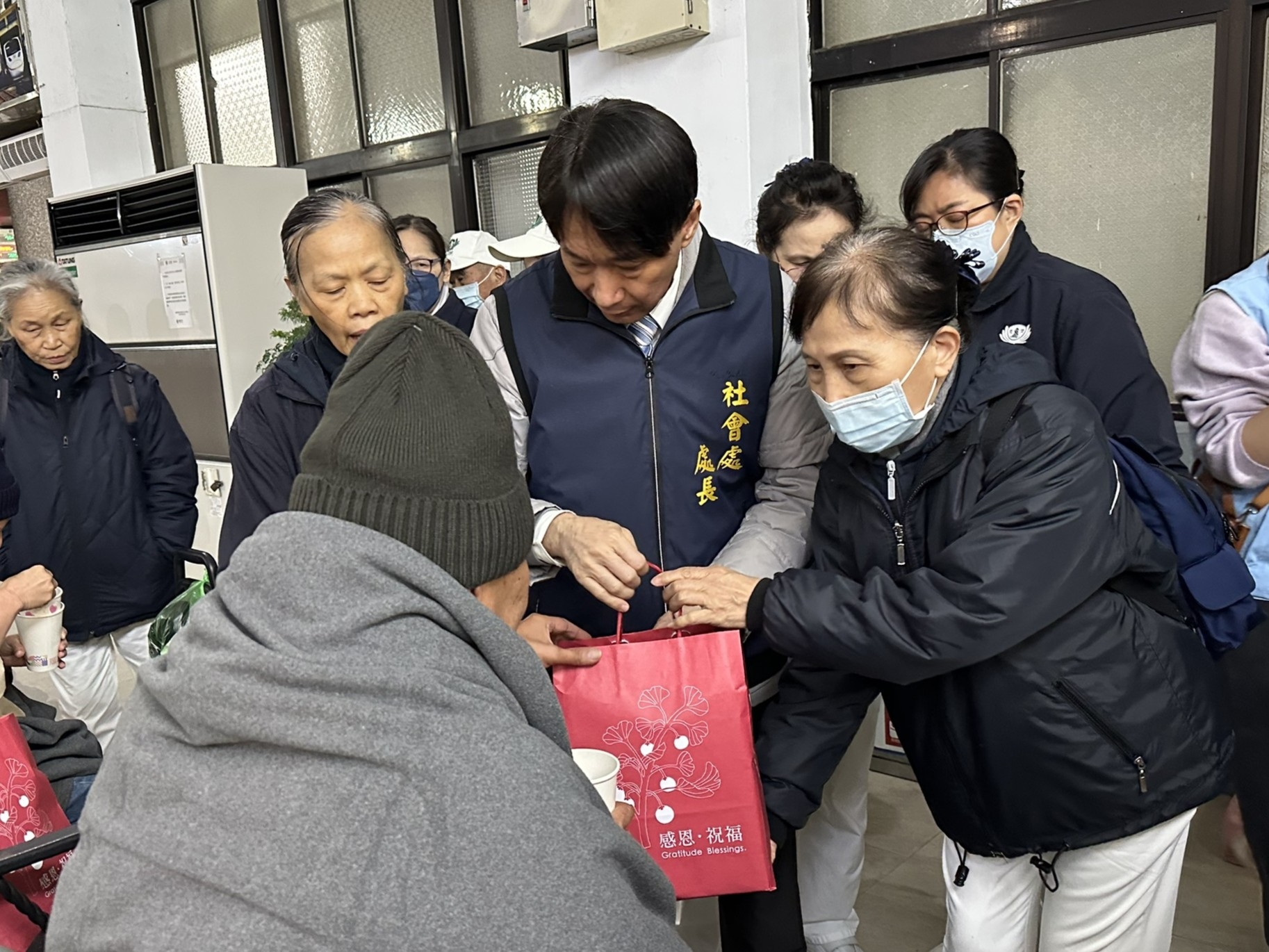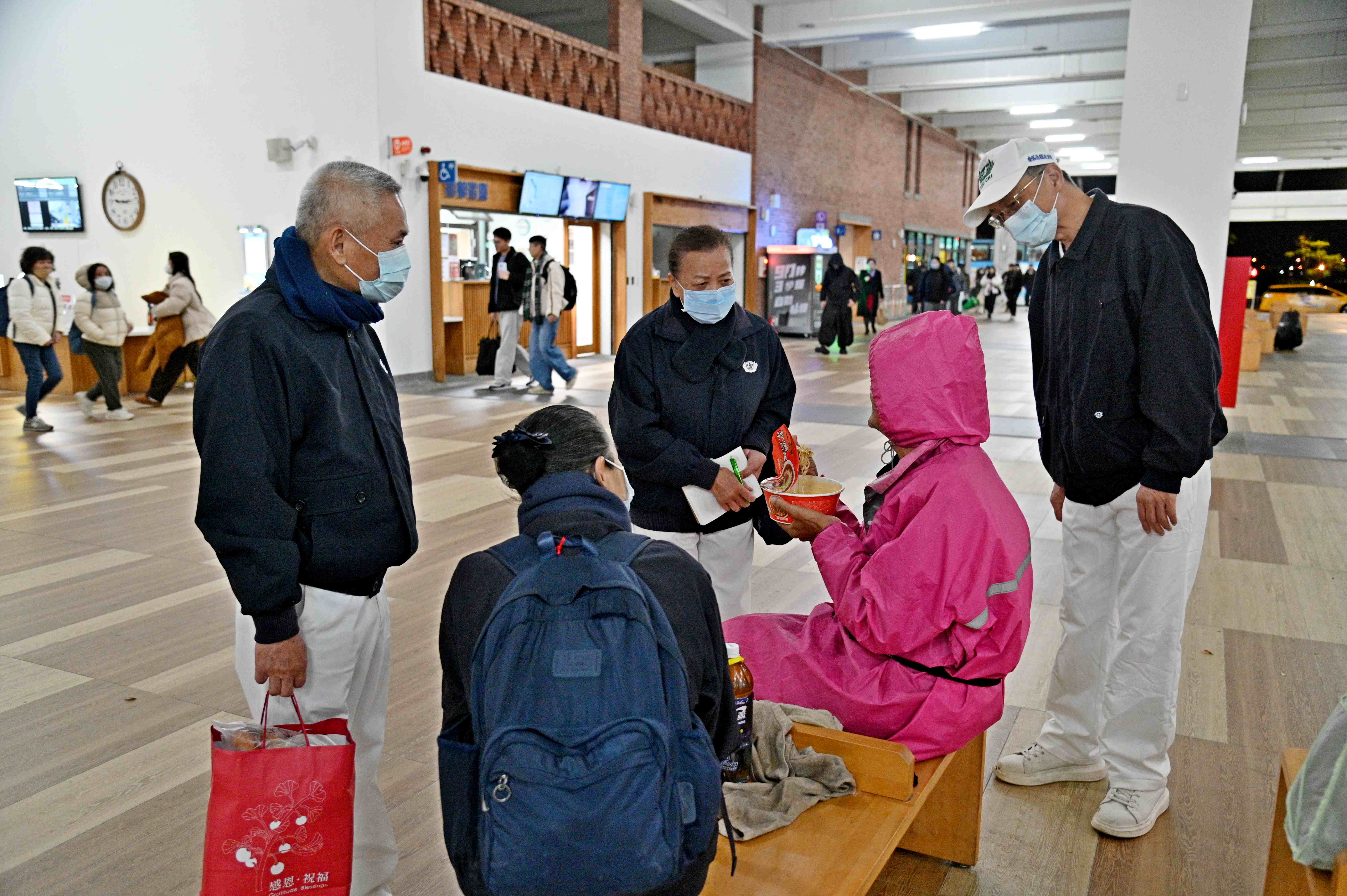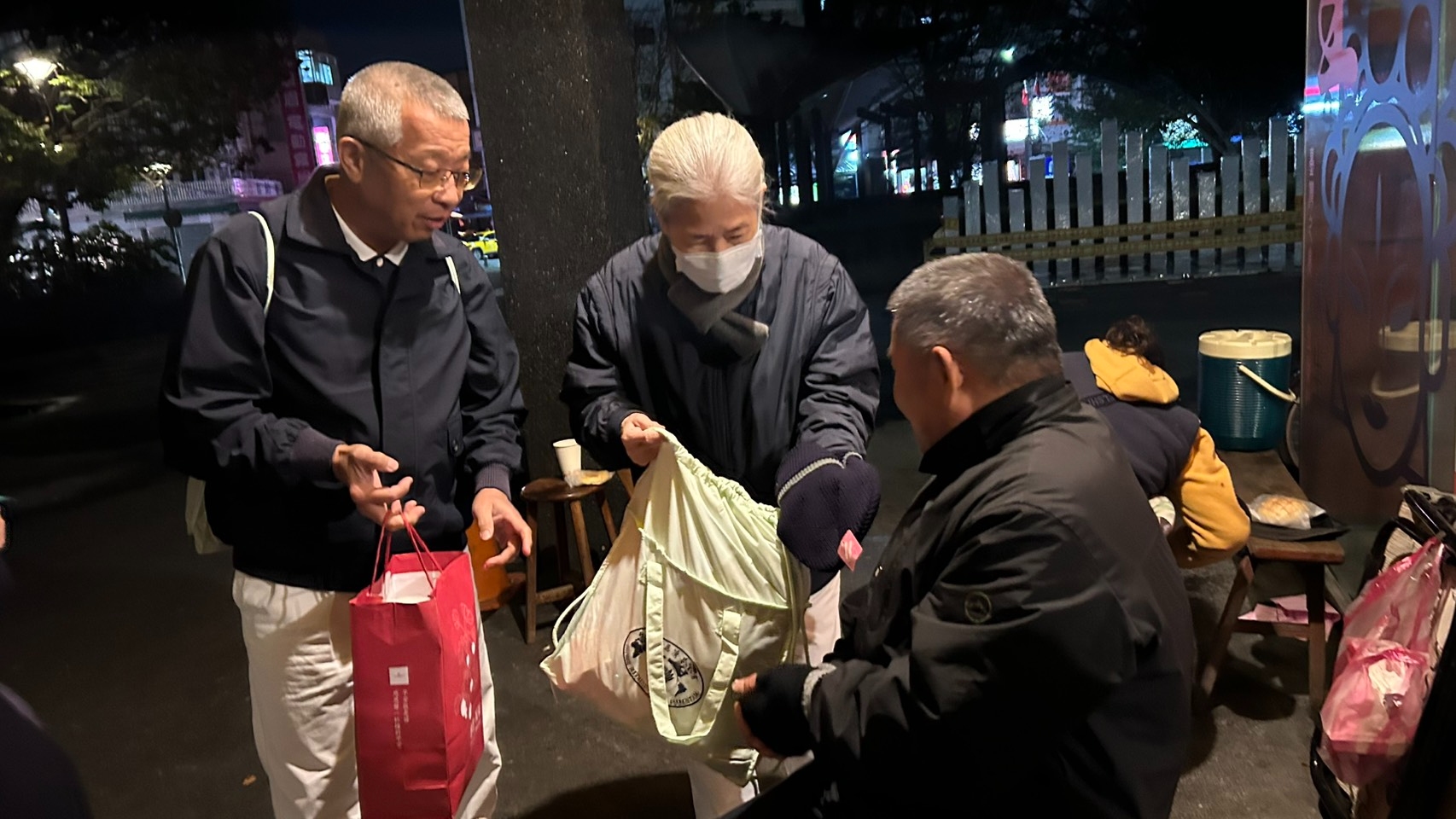 一行人帶著熱薑母茶、麵包、還有可沖泡即食的香積泡麵、米果、豆漿粉、高纖豆皮脆片給予寒士果腹,以及暖身的毛線帽、圍巾、手套、毛襪、毛毯、暖暖包等禦寒物資,送給蝸居在各處的寒士們,暖胃、暖身更暖心。