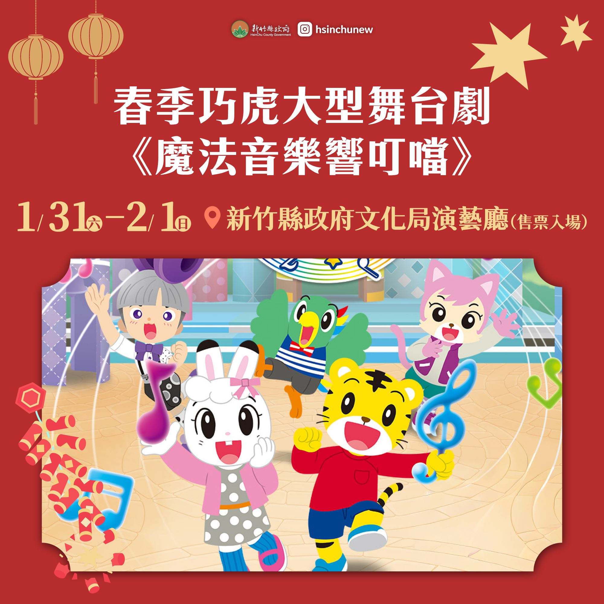 親子與文化活動同樣精彩,1月31日至2月1日推出春季巧虎舞台劇《魔法音樂響叮噹》,適合親子共賞,即日起開始售票。1月31日起至3月31日,在新瓦屋客家文化保存區辦理「2026福客慶豐年」,以客家文化展演及節慶布置,營造濃厚年節氛圍。
