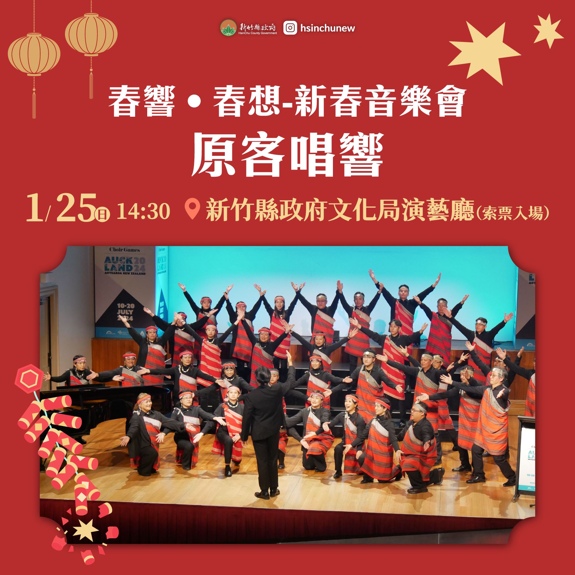 系列活動首先由「春響‧春想—新竹縣新春音樂會」揭開序幕,1月24日於文化局演藝廳演出〈龍騰樂典〉,1月25日接續推出〈原客唱響〉,透過精緻音樂饗宴,傳遞新春祝福,兩場音樂會即日起線上免費索票。1月29日至2月8日則於遠百竹北店7樓舉辦「新竹良品展售活動」,集結在地優質品牌與特色產品,提供民眾年節採購好去處。
