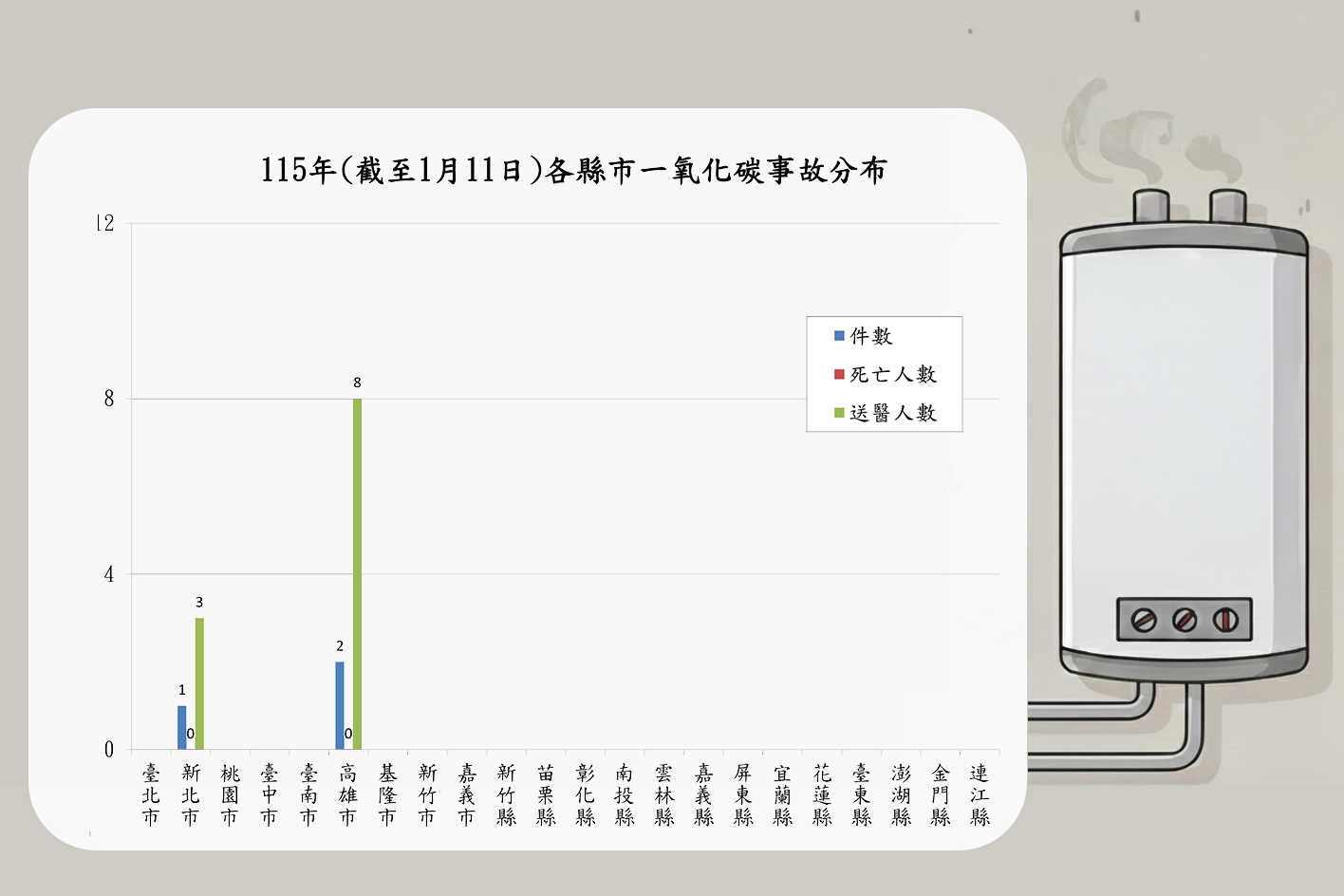 根據消防署最新統計數據顯示,115 年開年至今全台已發生3起一氧化碳中毒案件,共計造成11人送醫治療,所幸並未造成人員死亡。