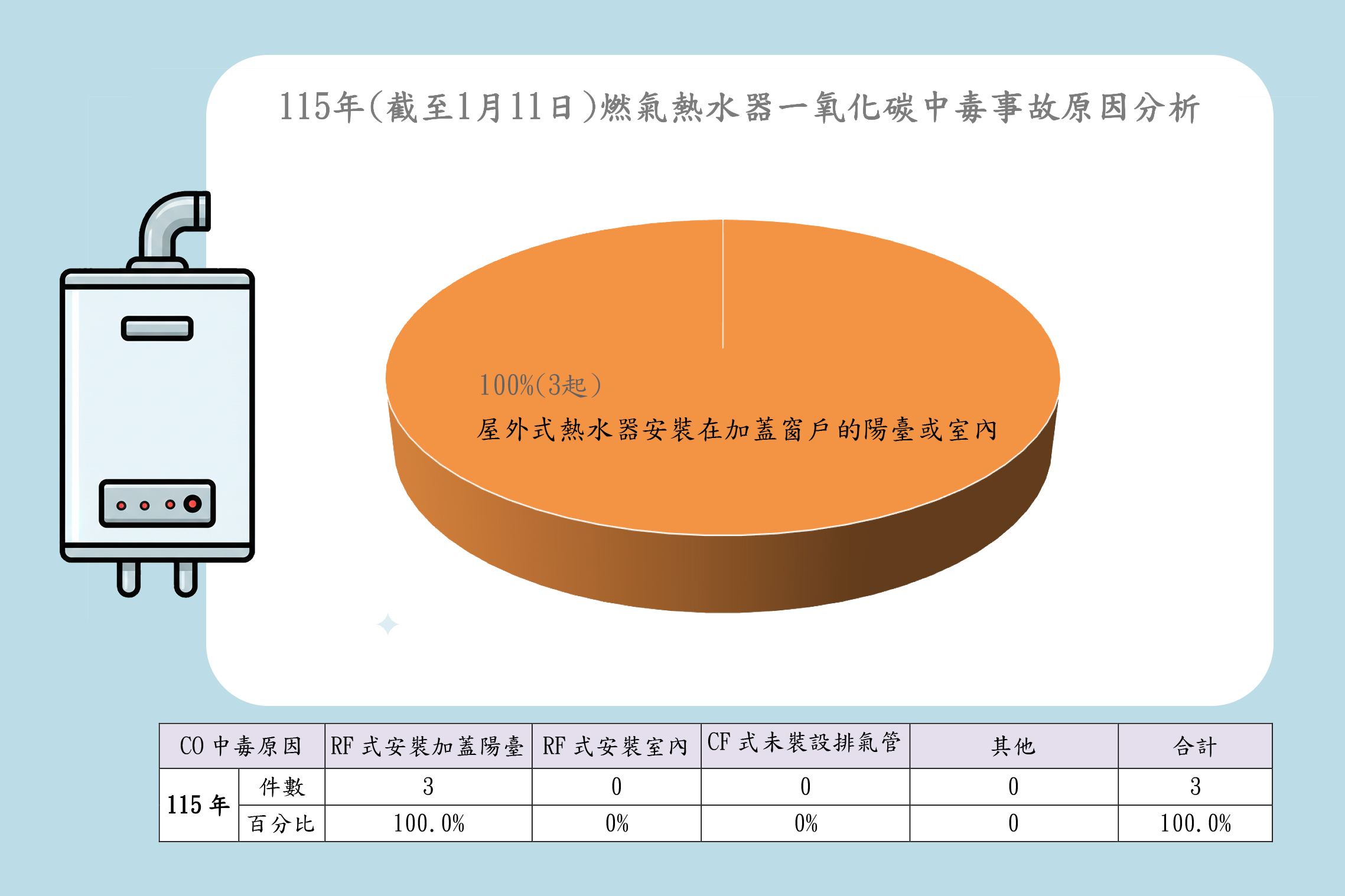 統計資料指出,這三起案件均發生於元月份。首宗案件於元月3日發生在新北市,造成3人受傷送醫;隨後在8日與10日,高雄市接連發生兩起中毒事件,每起案件各有4人送醫。短短一週內,高雄市便累積了8名傷者,顯示出低溫期間居家通風問題不容忽視。 這3起案件的發生原因比例高達100%,全數皆是因為將「屋外式熱水器(RF 式)」安裝在加蓋窗戶的陽台或室內通風不良處所導致。