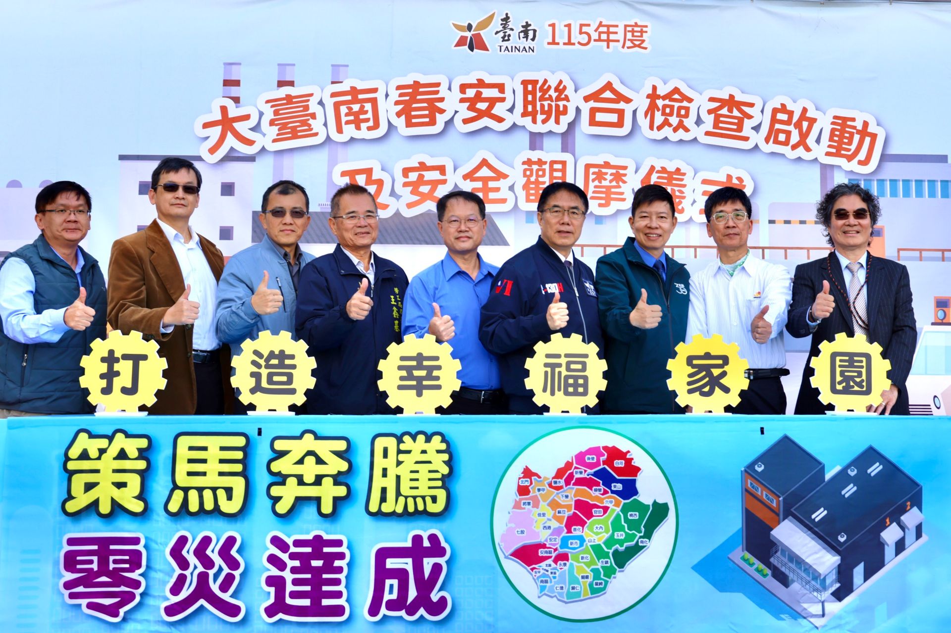 市長黃偉哲表示,年關將至,各行業勞工朋友忙於加班趕工更加辛苦,企業主應提供安全無虞的職場環境,尤其高風險產業,更應留意維護安全。市府攜手勞動部啟動「大台南春安聯合檢查」,目的在督促事業單位把「職場安全衛生」放在所有工作的最前面,期許在全力拚經濟之前,先把安全防護做好,降低職場危害風險,惟有安全健康的勞工,才能讓企業穩健前行。
