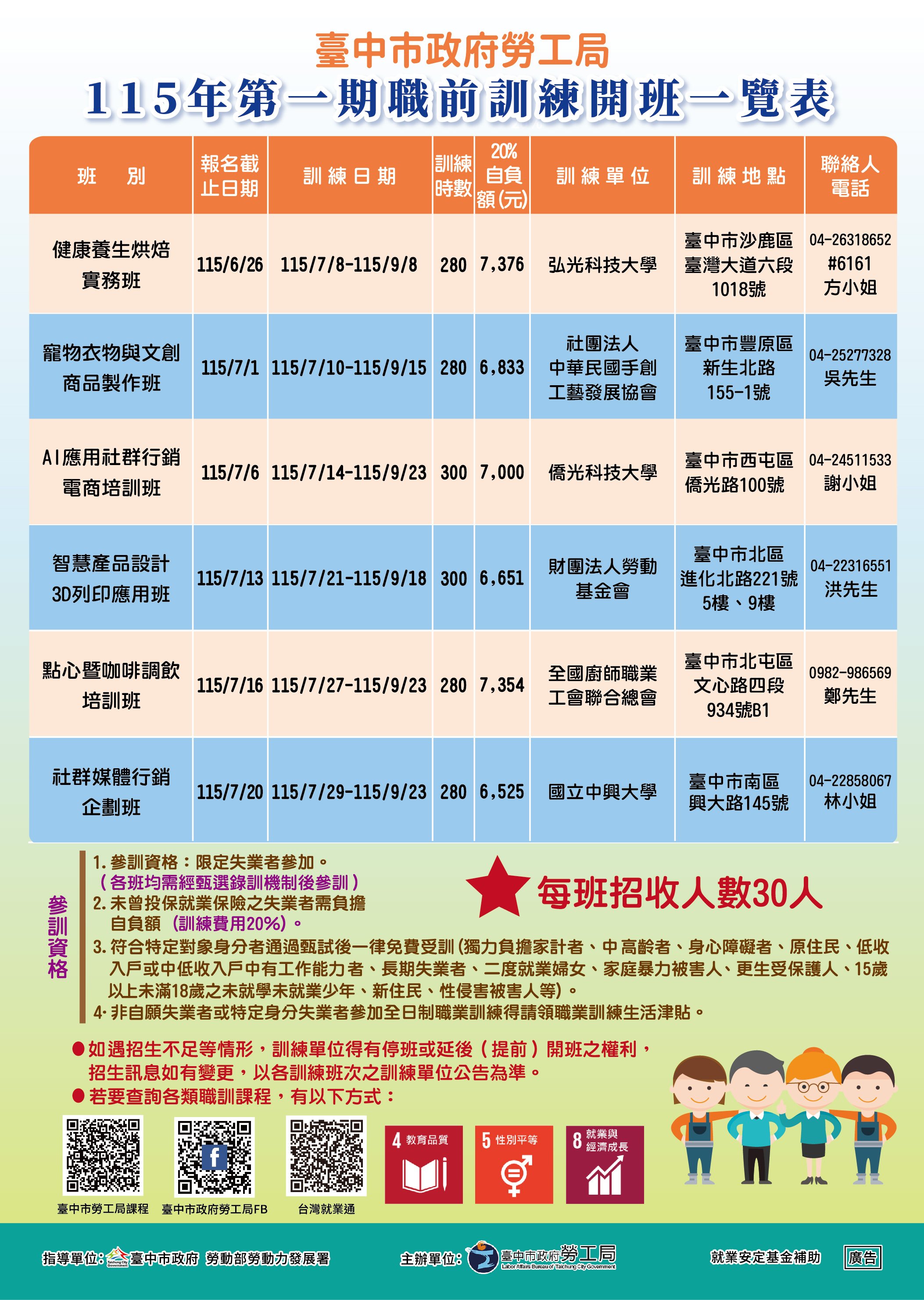 勞工局長林淑媛表示,今(115)年規劃六大類共30班職前訓練,第一階段因應人工智慧快速發展,AI應用已逐漸成為各行各業的重要核心能力,特別規劃包含AI人工智慧與數據分析、AI多媒體商業設計、AI應用社群行銷電商、行政人員雲端AI應用及首辦居家清潔收納、持續辦理熱門的銀髮族增能活動設計指導員,坐月子服務培訓班,另外還有一直都熱度不退的餐飲類課程,包含了健康養生烘焙及點心暨咖啡調飲培訓班等。