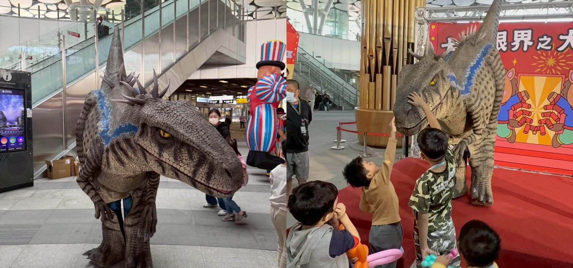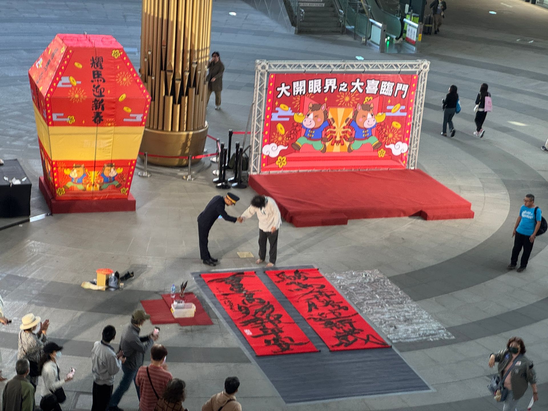 首週(1/24-1/25)以「大喜臨門」為主題,中央廣場1/24邀請書法名家現場揮毫創作大型春聯,1/25由國寶級陀螺達人帶來「超大陀螺」精彩演出,搭配市集活動,展現傳統技藝之美,為現場增添濃厚年味。另於北側廣場1/24-2/1同步推出《大開眼界之恐龍集結》樂園,設有大型恐龍紙迷宮及2公尺高穿戴式機械恐龍互動秀,打造寓教於樂、親子同樂的沉浸式體驗空間。