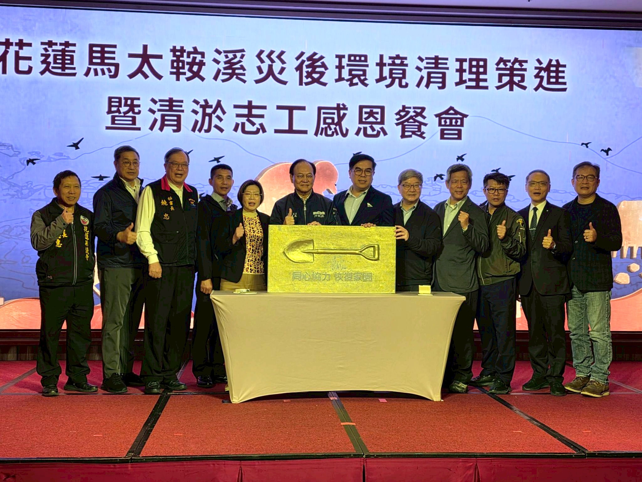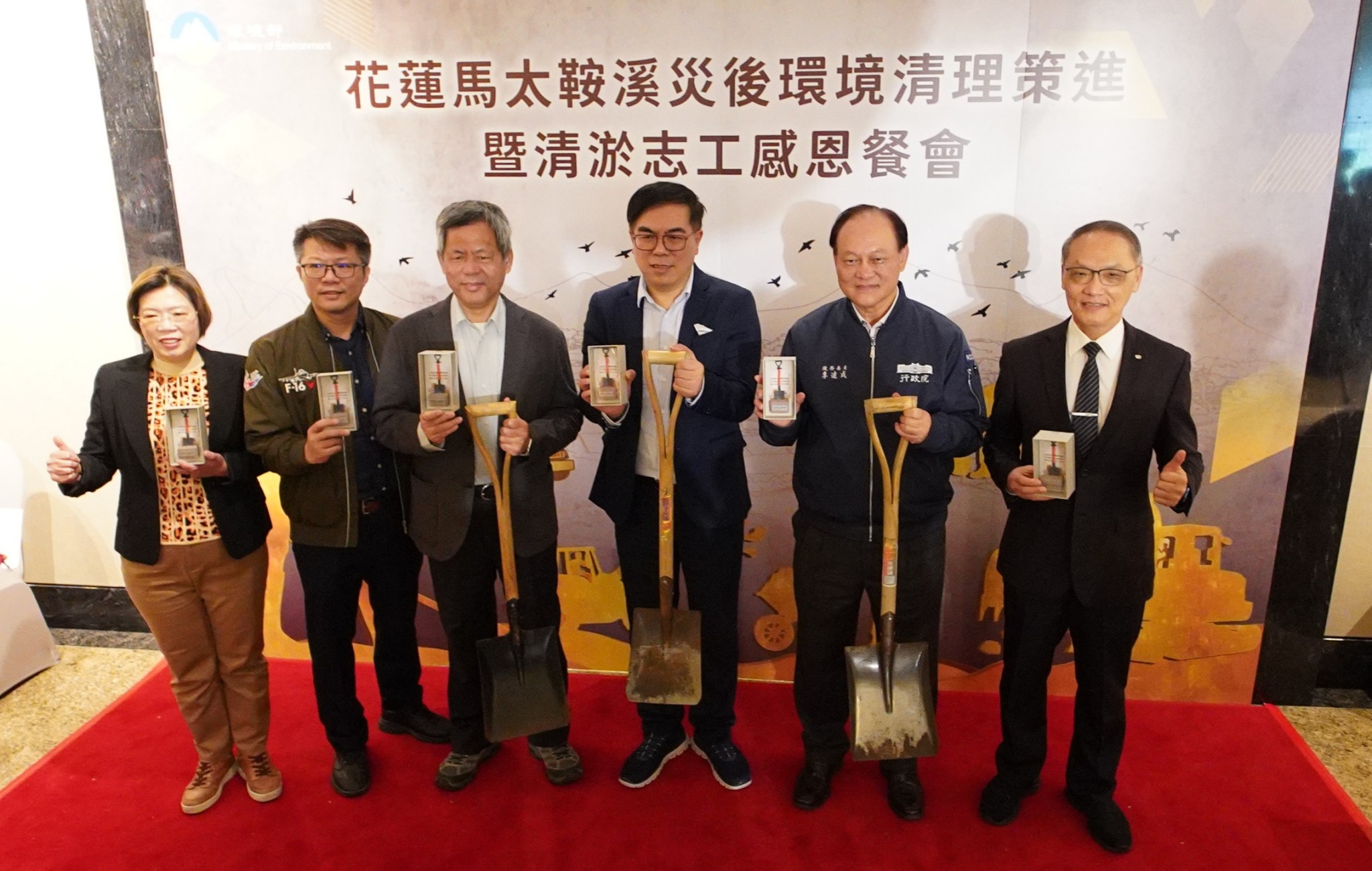 「謝謝大家,感謝超人們。」環境部1月25日在花蓮舉辦「花蓮馬太鞍溪災後環境清理暨清淤志工感恩餐會」,表揚並頒發紀念獎座及感謝狀給120個公私機關與團體,與會者約400位。行政院政務委員季連成、環境部長彭啓明向每一位辛勞奉獻的「超人」、「勇士」們表達最誠摯的感謝與敬意。活動融入原民文化,以豐年祭最高禮遇拉開序幕。