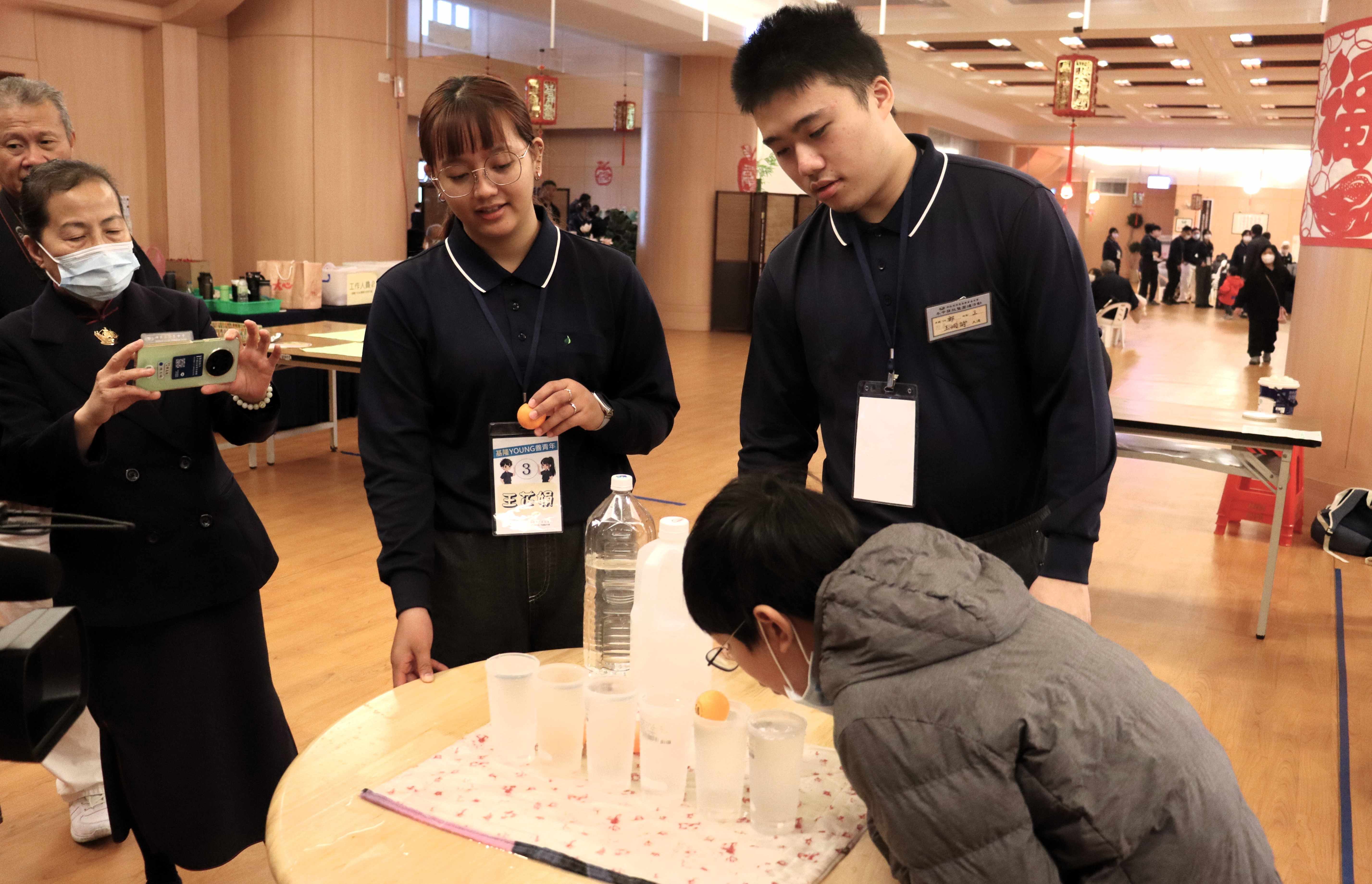 前來參加圍爐發放的鄉親在報到後,先自由參與分站活動,可以到義剪區,由美髮志工幫忙打理出新髮型,或是品嘗志工準備的暖心燒仙草,如有健康問題需要諮詢,慈濟人醫會的醫護志工也駐站提供服務;今年還有青年志工-揚善青年準備了趣味遊戲關卡,要跟今日前來的鄉親進行互動,此外,這群青年志工們在今年冬令圍爐活動還承擔了節目主持及上菜等桌邊服務,展現年輕人的善實力。