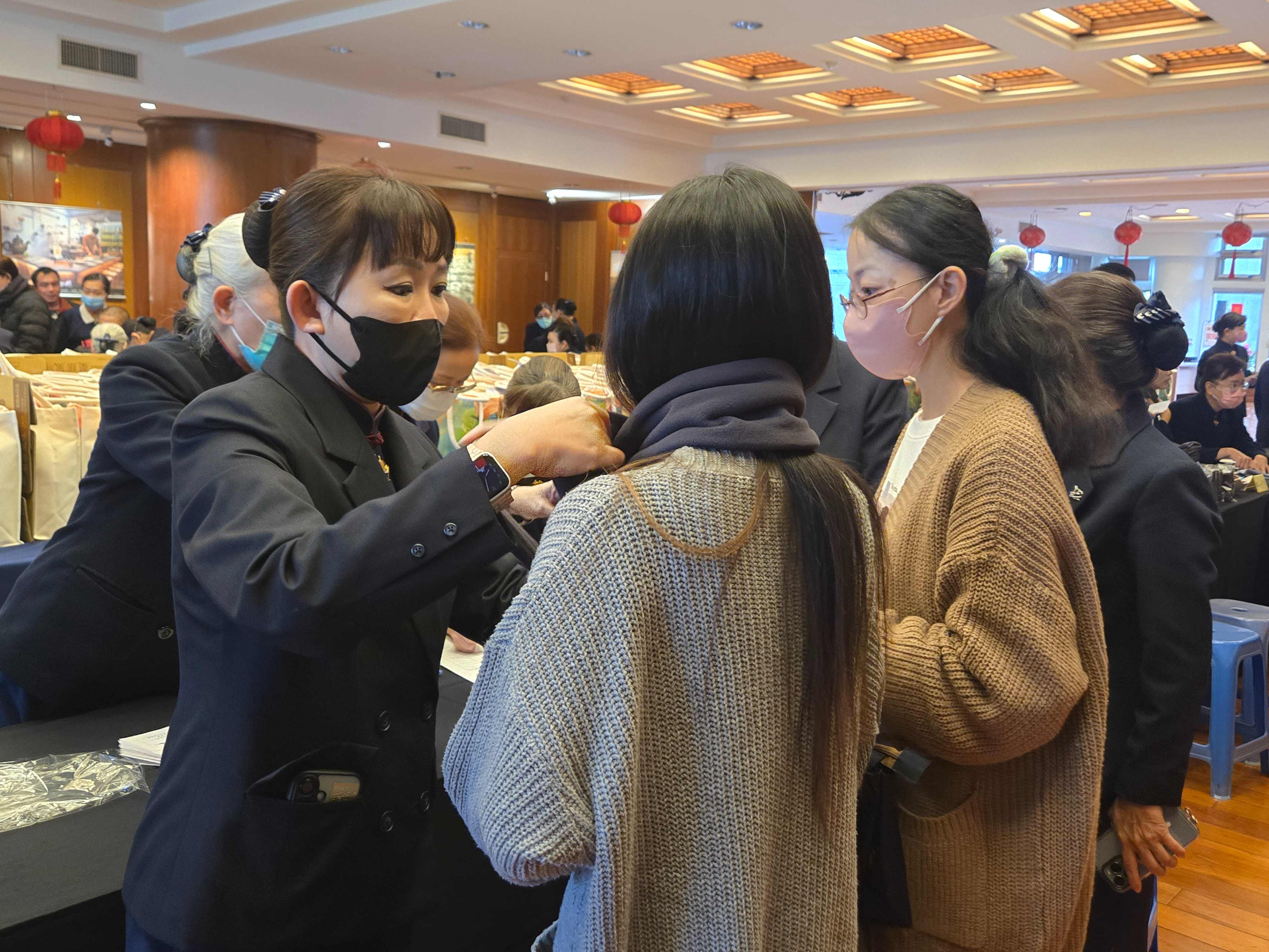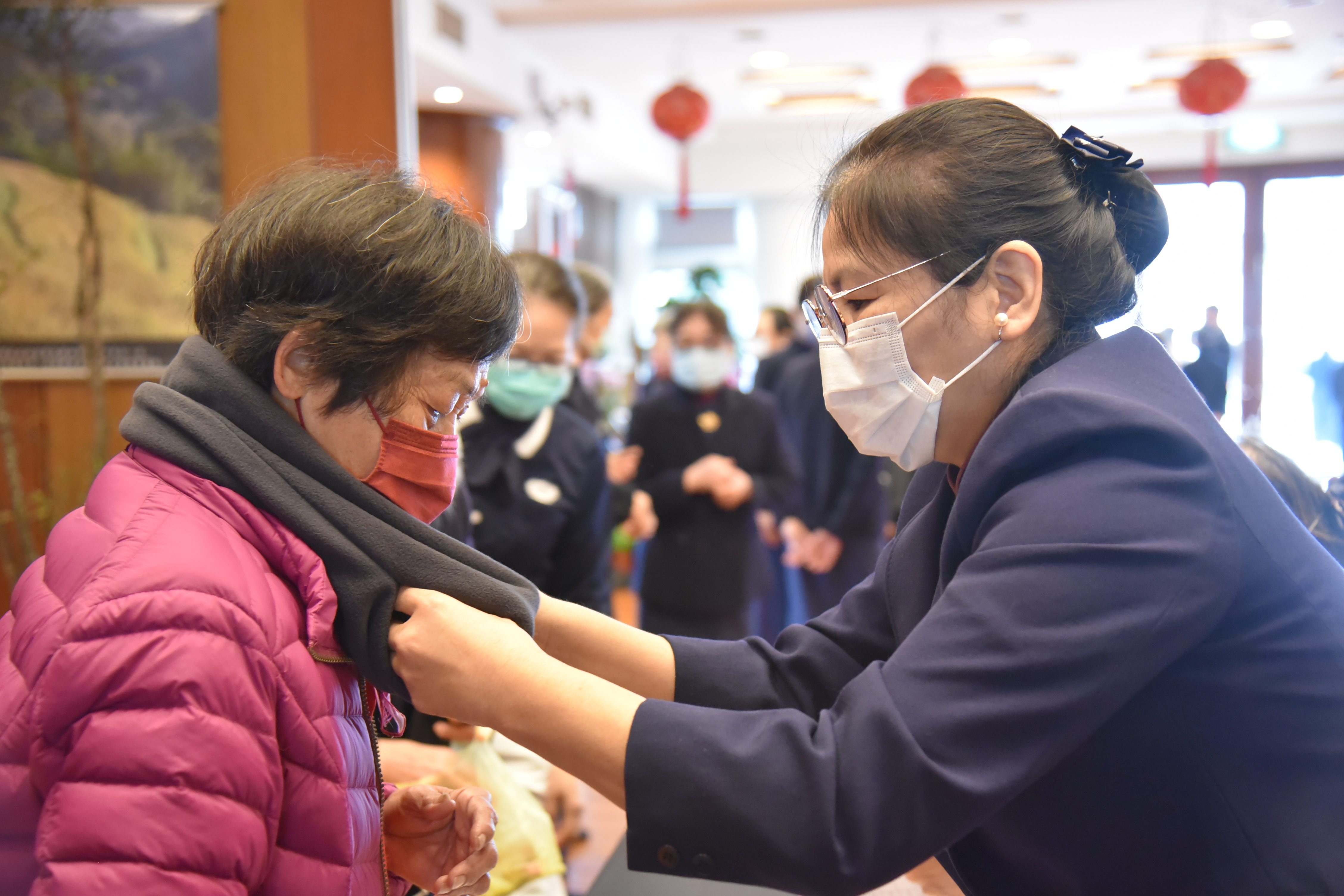 今年的冬令發放天氣雖然很冷,但一早來報到的鄉親,除了有收到親切的問候,志工也都為他們一一地在脖子上圍上溫暖的圍巾,讓照顧戶的家人們不僅暖身又暖心。