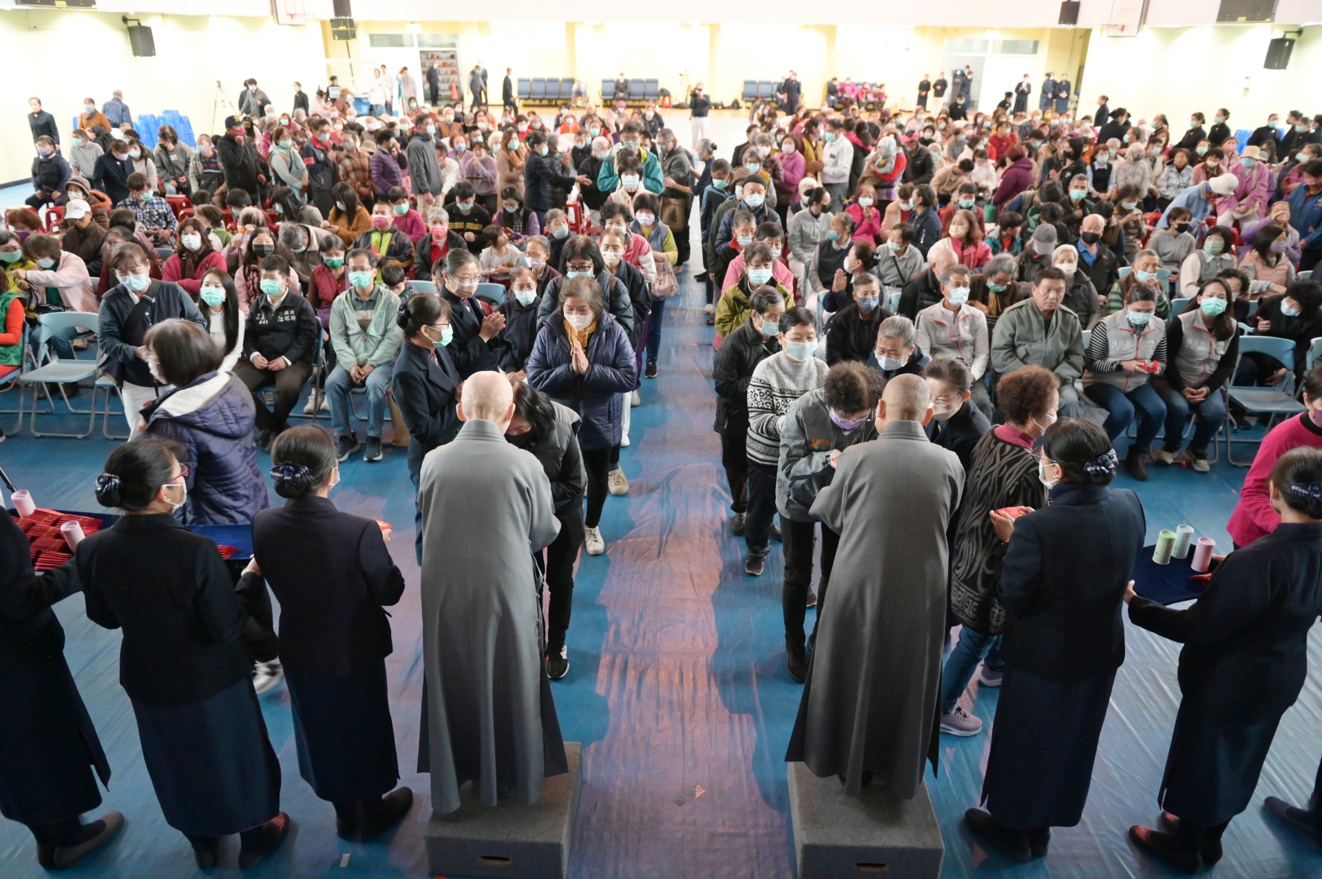 全體專心地聆聽德林師父開示:「很高興第一次來到貴寶地,很感恩大家的護持,原本以為來這裡很不方便,擔心下雨請志工們趕搭帳篷,發現這裡有很多的長者,雖然在戶外舉辦,但是看到大家人人都有好福氣,天就有好天氣非常好,趁新年的味道還很濃厚,祝福大家幸福美滿一輩子,造福要靠自己造,如何造福?可以很簡單的造福,第一就是吃素,上人說:『非素不可,不要吃欠債餐』;第二就是莫忘竹筒歲月初心,起善心行善行,日日行善、日日造福,新一年的開始就要有智慧的造福行善,祝福大家有幸福美好的人生。」